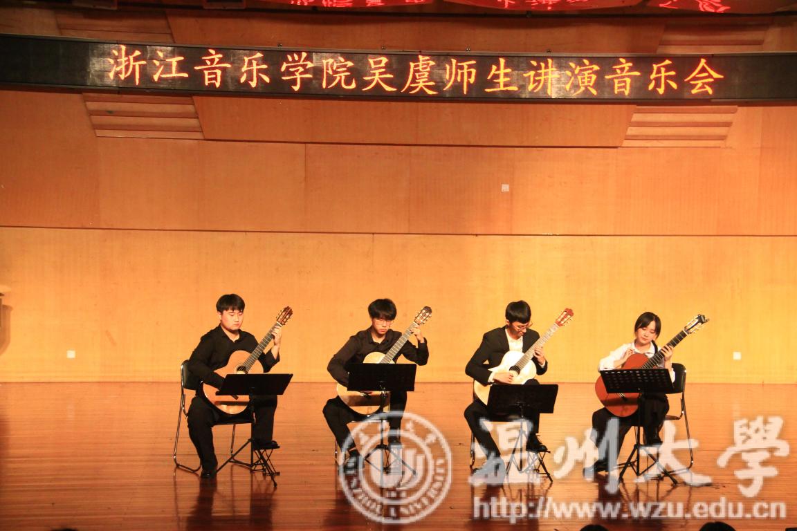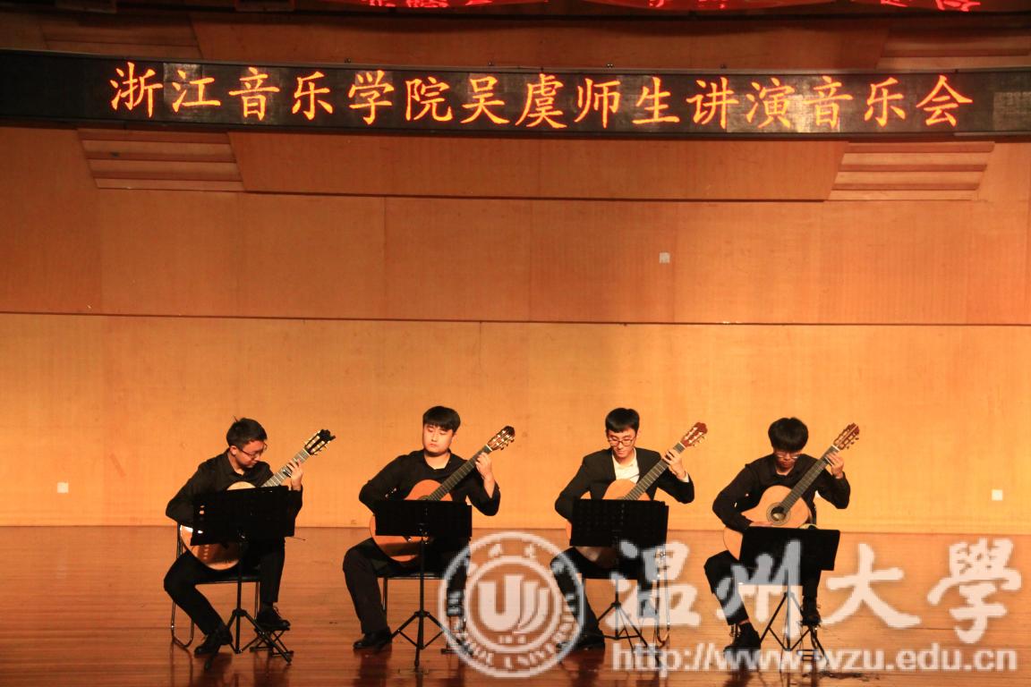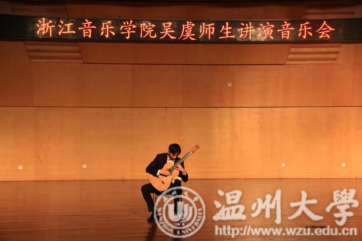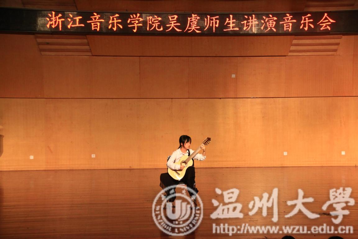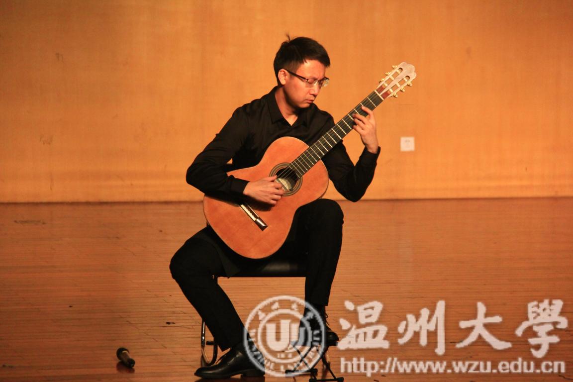 音乐会以吴虞老师的独奏拉开序幕,吉他声婉转而悠扬,仿佛诉说着对生活的向往,带有强烈的南美洲民间色彩。接下来是由江海延演奏华金罗德里戈的《三首西班牙乐曲》,只见舒缓的音乐响起,演奏者拨动吉他的弦,奏出弯曲的平行线,华光从缝隙倾限,失去在不经意间,让人心旷神怡。一曲落幕,一首极富节奏感的小奏鸣曲迎面而来,是由浙江古天乐代言太阳集团138优秀新生叶子亨带来的西班牙乐曲托罗巴的《小奏鸣曲第一乐章》,乐曲节奏明显,将人带入浓厚的西班牙欢快民俗氛围。紧接着,我们迎来了三重奏《世纪末》,由杜峥、陈沁宇、叶子亨三位同学共同演奏的乐曲。吉他的旋律有高有低、节奏有快有慢、情感抑扬顿挫。展现了多种多样的音乐风格。同时从古典音乐的旋律歌词之中,我们领略到了历史长河发展的经久不衰。接下来,是由吴虞老师以及他的员工江海延、杜峥、叶子亨共同带来的《蓝色大海的回声》,轻快的节奏,仿佛走在鸟语花香的乡间小路上。时而转变风格,让人陶醉在优美的音乐旋律里而“沉醉不知归路”。时间如白驹过隙,转眼间音乐会已经接近尾声,观众的热情依旧不减。随即,自由形式的乐曲在大厅里奏响,这是意大利著名作曲家泰德斯科的《魔鬼绮想曲》,表演者为杜峥。细细的琴弦飘出,有时行如流水,有时势如破竹。宛转悠扬的旋律回荡在整个音乐厅。