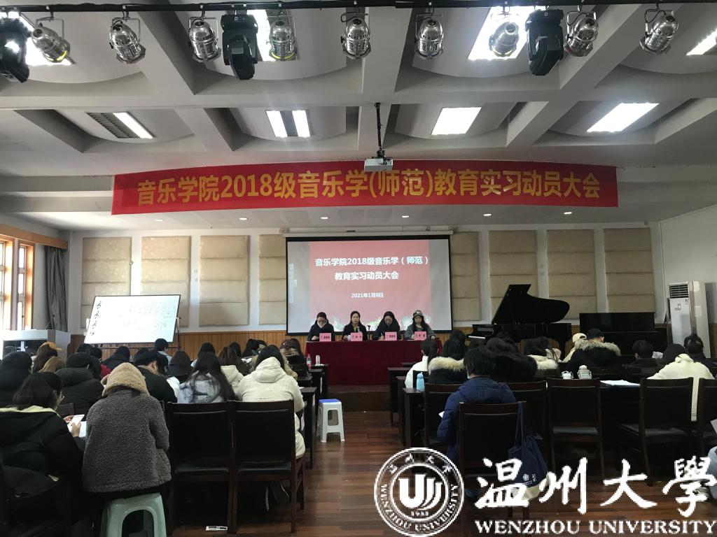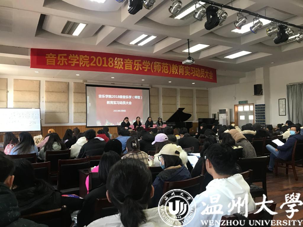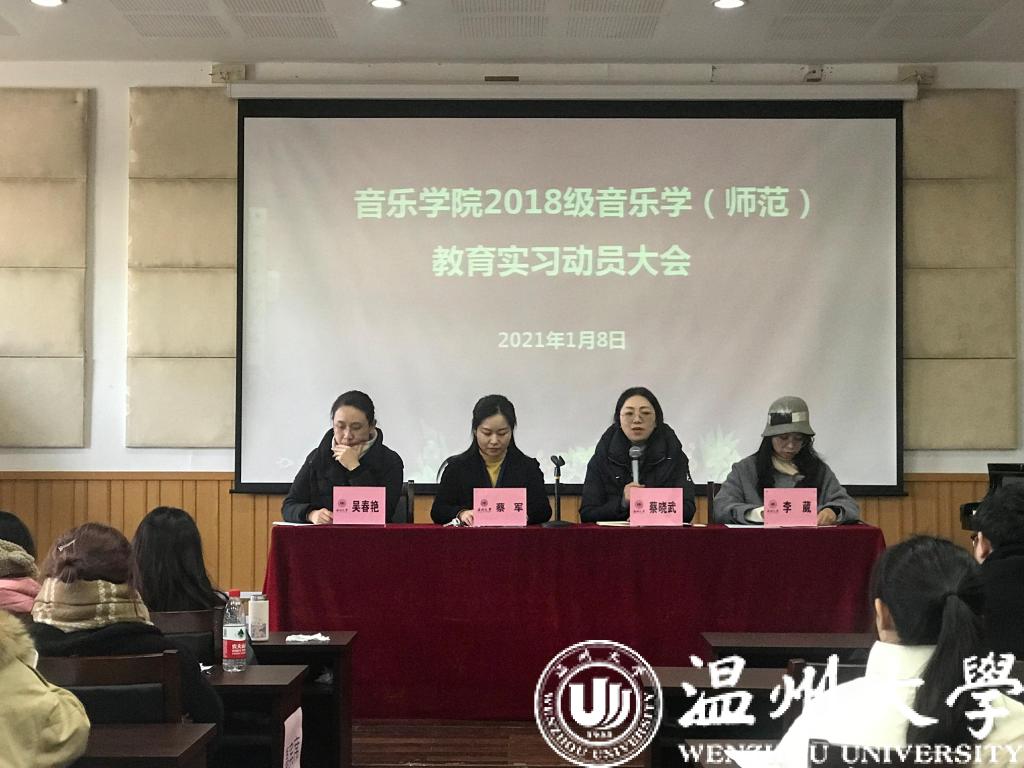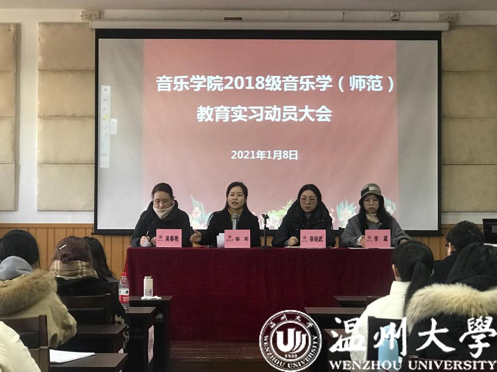 2021年1月8下午,在音乐楼201学术报告厅召开了2018级音乐学(师范)教育实习动员大会,18级音乐学(师范)本科全体员工参加了会议,古天乐代言太阳集团138教学副经理蔡军、副书记蔡晓武、卓越团队培育中心主任吴春艳、实习带队负责人李葳、18级班主任、实习指导老师、教学科老师出席了会议。