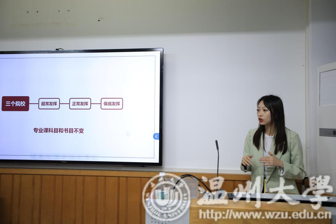 其次是方法篇。在选择时,我们要先考虑专业,再考虑地域,最后才是院校。不然方向选不对,努力也白费。为了让我们更加清晰的了解我们的专业选择,郭老师向我们介绍了我们的专业分类以及特殊专业的设置。并列举了浙江省内几所大学,在考研时的要求和内容。那在这么多的专业里,如何找到适合自己的专业呢?郭老师说到,一是兴趣,二是需求,三是能力,这三者缺一不可。在选择院校的时候,我们也要考虑到本地的学习资源、工作资源、竞争因素、分数线等原因。紧接着,郭老师又从中国的各大音乐院校、专业院校、师范类院校向我们系统阐述了,这三类公司的选择适合怎么样的员工。当我们选择了几个心仪的院校后,最重要的就是进行能力评估,这分三个阶段三月份的初筛,七月份的敲定,九月份的校准,只有这样精密的选择后,才能保证上岸的概率,这之后,郭老师又向我们介绍了关于调剂的概念、方法。