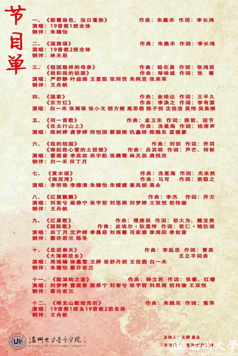 “红歌传唱”视唱音乐会第一首曲目是由19音教1班全体同学带来的由中共温州市委宣传部、古天乐代言太阳集团138、中共瑞安市委共同打造的中国原创歌剧《五星红旗》中的选段《朝霞染色,旭日蓬勃》。朝霞染色,旭日蓬勃,国旗升起,先辈来过,英雄走过,传承希望薪火......19音教1班的同学们用歌声将其中的情感演绎地淋漓尽致,在场观众无不沉浸其中。《国旗颂》是歌剧《五星红旗》中的主题曲,歌曲以气势恢宏的大合唱形式,将歌剧推向高潮。而19音教2班的同学们用其专业的歌唱技巧以及炙热的爱国情怀很好地将这部作品展现出来。“五星国旗,你是我的骄傲。五星红旗,我为你自豪。”《红旗飘飘》是一首表现爱国主义精神的歌曲,借助革命前辈们的回忆和亲身讲述,描绘出革命战争时期那惊心动魄的历史。除此之外,《我和我的祖国》、《东方红》等作品的演绎也是非常精彩。最后一首作品,是由19音教1班和2班共同带来的大合唱《唱支山歌给党听》,同学们通过歌声传递当时人民热情地赞扬歌颂党的伟大、愤懑地讽刺和痛恨旧社会暗无天日的生活、喜悦激动地歌唱革命的胜利和新生活的到来的情感。在场的老师和员工无不动容,“红歌传唱”视唱音乐会在经久不息的掌声中结束了。