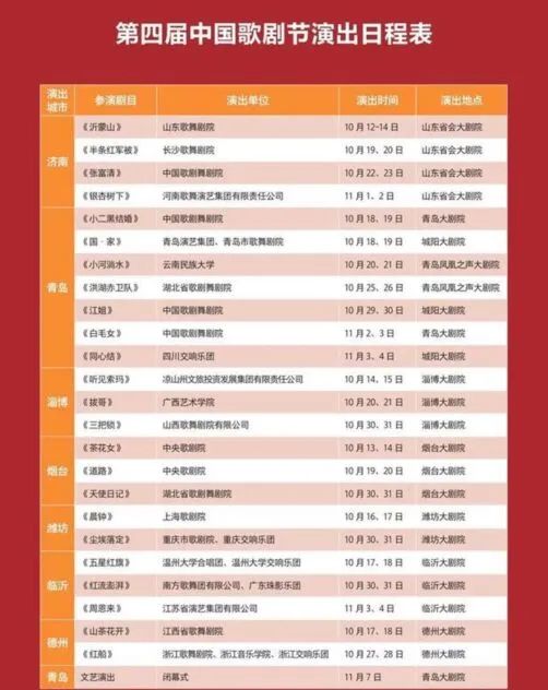 中国歌剧节是由中华人民共和国文化和旅游部主办的,歌剧领域最高级别的国家级艺术盛会。入选作品强调民族精神、时代意义与国际视野,以歌剧讲述中国故事,弘扬中国精神,彰显中国气派。自2011年首届以来,已辗转福建、湖北、江苏三省,第四届歌剧节10月13日在山东济南拉开大幕。