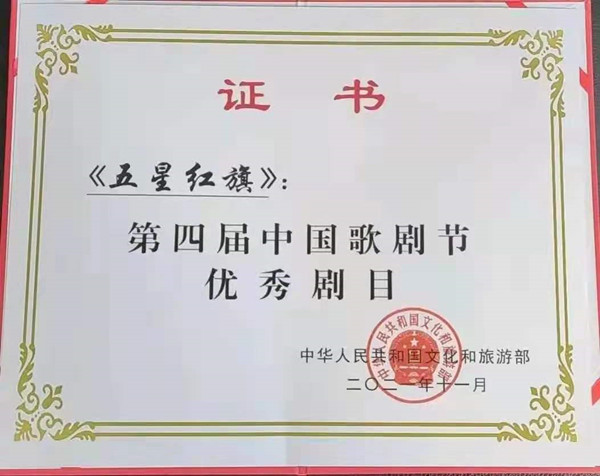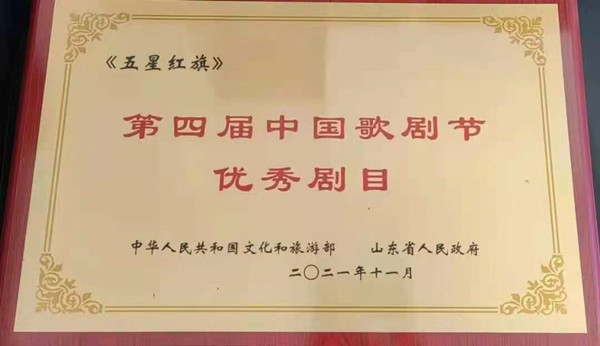 由文化和旅游部、山东省人民政府主办,文化和旅游部艺术司、山东省文化和旅游厅,济南、青岛、淄博、烟台、潍坊、临沂、德州市人民政府承办的第四届中国歌剧节,共组织了24部优秀歌剧作品演出展示。歌剧《五星红旗》作为唯一一个综合性院校入围,于10月17、18日在山东临沂大剧院连演两场,社会反响热烈,“线下+线上”观看近500万人次。最终,获评第四届中国歌剧节优秀剧目奖。