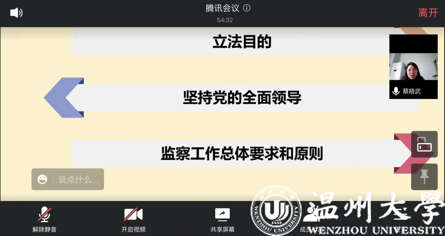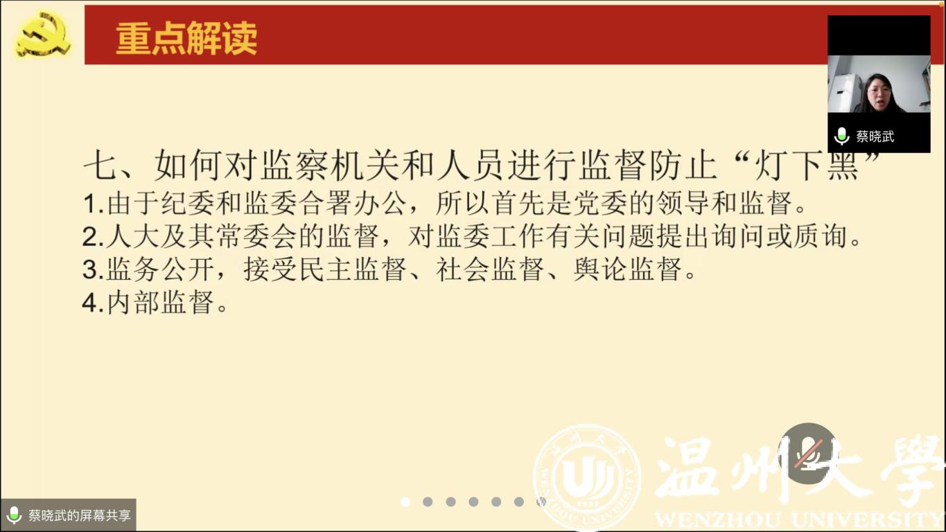 蔡晓武副书记领学党纪法规。《中华人民共和国监察法》分两部分,第一部分是总体解读,第二部分是重点条文解读。重点解读了监察机关及其职责、监察范围和管辖、监察权限、监察程序、对监察机关和监察人员的监督、法律责任等。《中华人民共和国监察法实施条例》,推动监察工作法治化、规范化, 监察机关与党的纪律检查机关合署办公,坚持法治思维和法治方式,实现党对国家监察工作的领导。《中华人民共和国公职人员处分法》重点解读了公职人员的范围、政务处分的种类和适用、违法行为及其适用的政务处分、政务处分的程序、复审、复核,法律责任等。