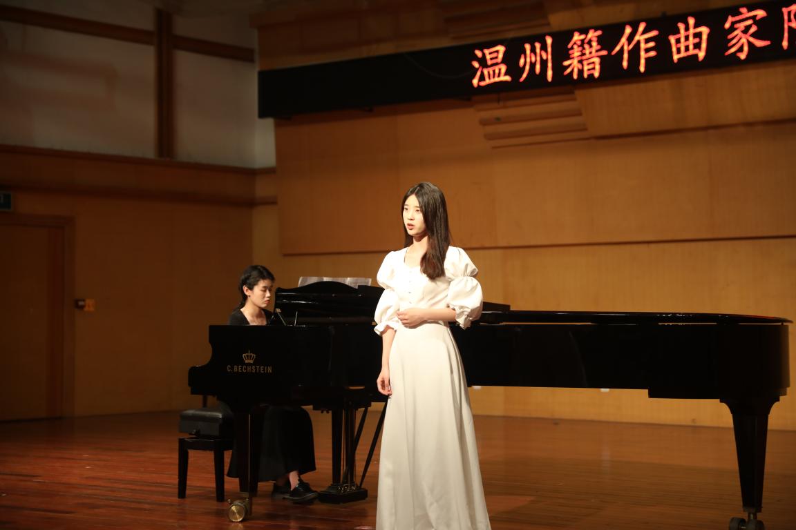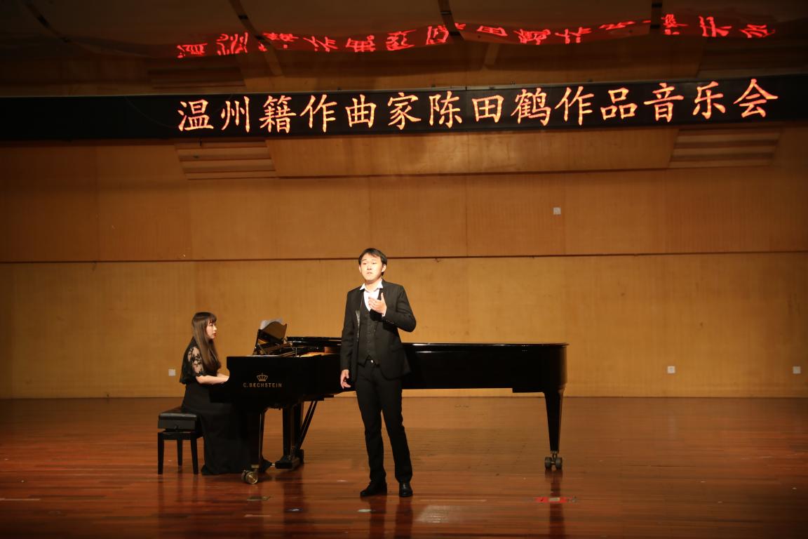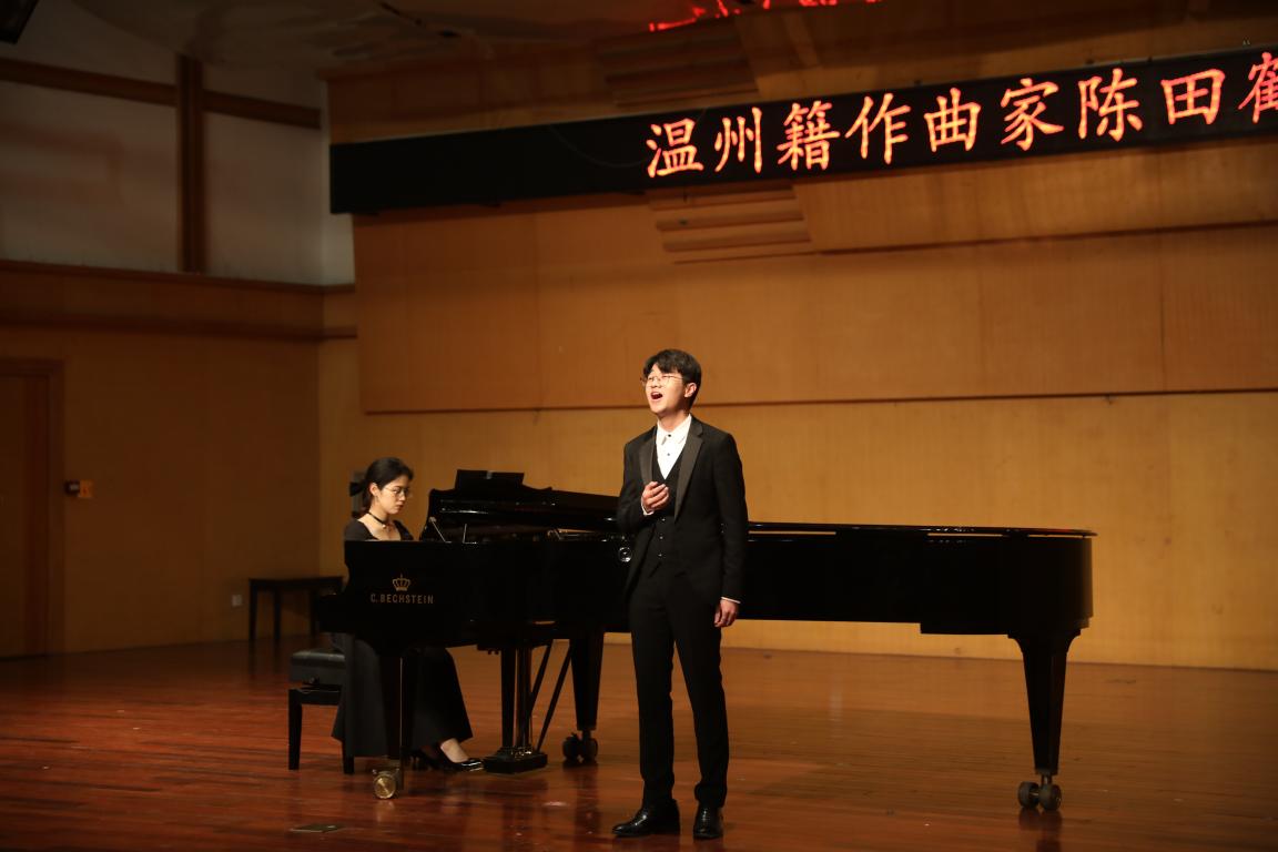 昨晚的《温州籍作曲家陈田鹤作品音乐》选取了陈先生创作于不同时期的优秀作品15首。随着热烈的掌声响起,张珂荧同学带来了钢琴独奏《序曲》。这首作品创作于1934年,在俄罗斯作曲家齐尔品征集中国风格钢琴作品的比赛中获第二名(第一名是贺绿汀先生创作的《牧童短笛》),该曲用再现三部结构,以五声调式特点的旋律,手法多样,织体清晰,音色丰富,在柱状和弦的伴奏衬托下,音乐厅渲染出欢腾热烈的喜庆气氛,后段的旋律在长琶音衬托下抒情且宁静。由王星凯带来的男生独唱《在那遥远的地方》这是一曲广为传唱的民歌,也是国内外不少歌手演绎过的经典之作,它曾随嫦娥一号绕月探测卫星升空。抒情的曲调表达出精致含蓄之美,优美的乐声在音乐厅慢慢流淌。