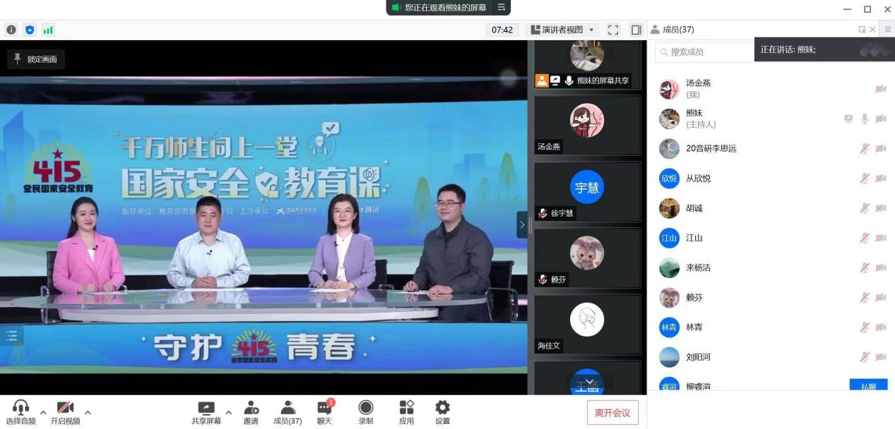 学习会上首先观看学习了中国老员工在线发布的2022年国家安全教育公开课以及中国反邪网发布的警惕邪教对大公司园的侵袭宣传片,同学们在会议过程中积极配合,反馈良好。通过观看学习,提高员工总体国家安全观的贯彻落实,培养和增强他们自觉投身国家安全责任感使命感。视频学习过后员工们纷纷表示对国家安全的概念有了清晰的认识,更加明确邪教对员工的伤害,以及遇到此类问题知晓如何防范。