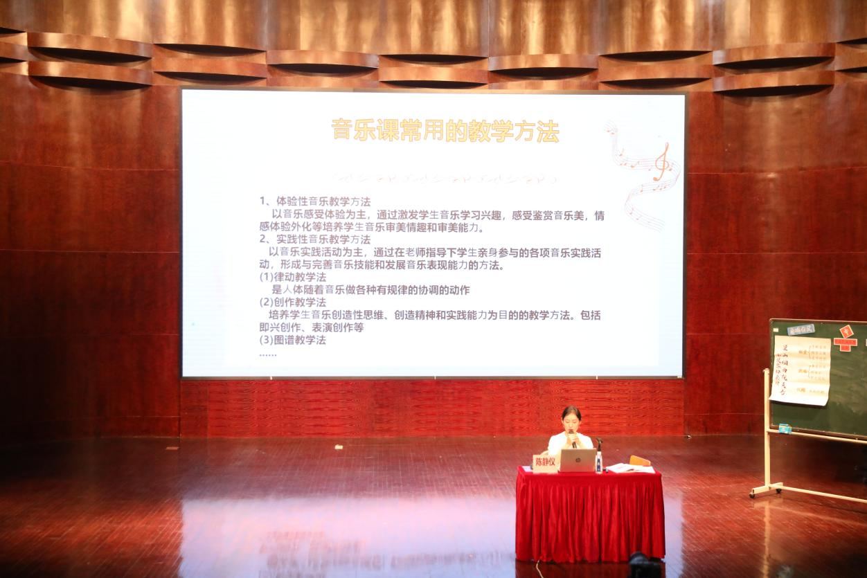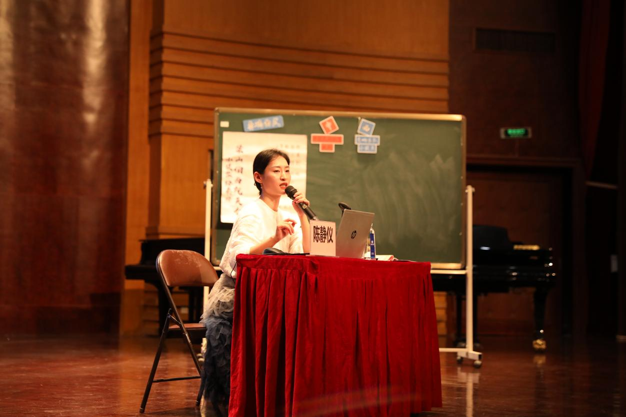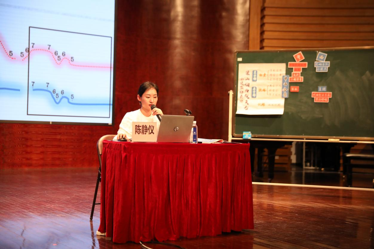讲座伊始,陈静仪老师用温柔的语气为我们缓缓讲述了构课的思路,并且以云南民歌《小河淌水》为例子明确的阐述了教学目标,为师范音乐生上示范课提供了一个清晰的思路。随后,陈静仪老师将《梁山伯与祝英台》的PPT课程详细拆分。从构课思路是“中西合璧”到“如何通过音乐表现作品的意向以及思想情感”,从引导员工自主思考到教授内容详细解释。陈老师充分激发了同学们的思考能力,将专业知识内容与视频和互动游戏结合了起来。在讲座的末尾,陈静仪老师特别提醒到:对讲课内容一定要有取舍,注意课堂的内容重点以及课堂的时间分布。