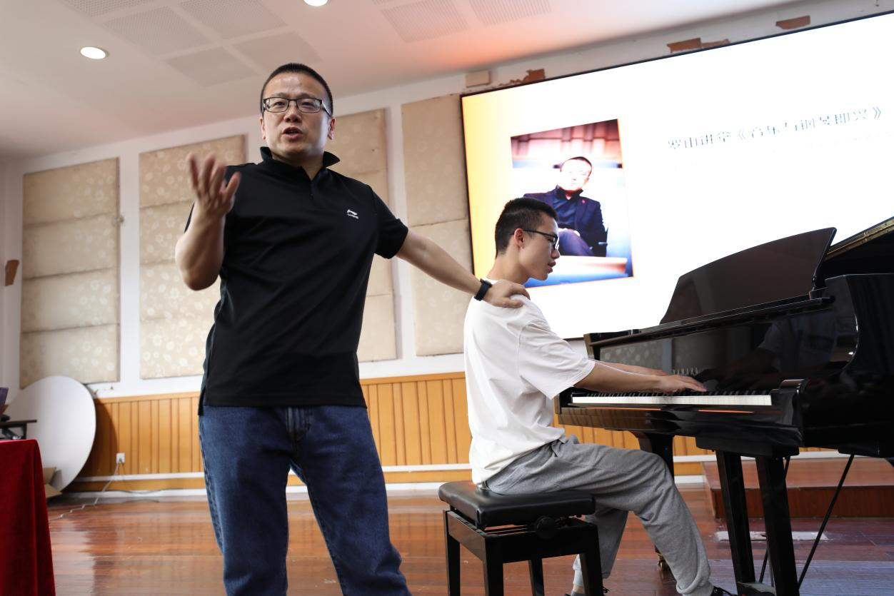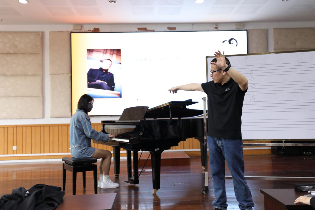 张教授提问,他在弹琴中有什么特别的地方?有同学就积极指出“踩踏板用左脚踩”“弹奏时表情丰富,身体放松”“琴凳歪了”等等问题。然后张教授解释到,对于一名未来的一名音乐教师,我们一定要以员工为主题,我们在做任何教学的时候,我们一定要保持跟员工的交流,目光一定要时时刻刻注意在员工上。