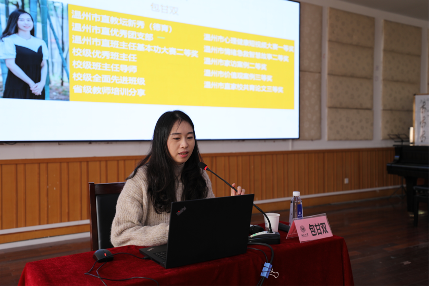 包甘双, 温州市直教坛新秀(德育),温州市直班主任基本功大赛二等奖,温州市直优秀团支部,温州市家访育人故事二等奖,温州市情绪急救智慧故事二等奖,温州市阳光少年说视频大赛一等奖。21音乐学(师范)班级同学参加了本次讲座,本次讲座由音乐理论系李葳老师主持。
