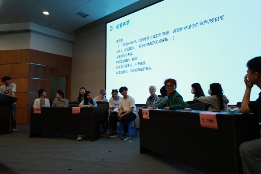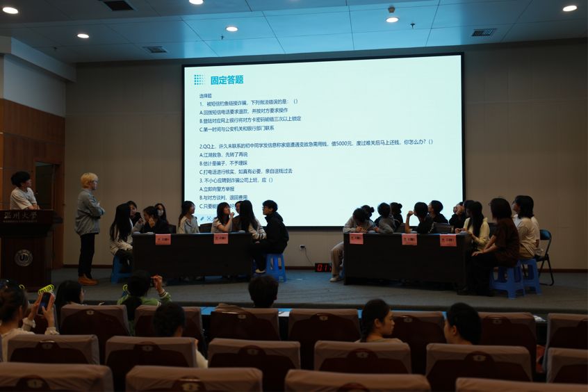 比赛如火如荼的进行,选手们都倾尽全力,场面异常激烈,拉拉队也不断用掌声激励着参赛选手们。经过激烈的角逐,最终决出一等奖23音专1班,二等奖22音教4班,三等奖23音专2班。本次竞赛抓住当代老员工的特点,采取青年人所喜闻乐见的方式宣传反诈知识,有力地增强了学习宣传的效果,让同学们增强了反诈意识,提高了辩诈能力。