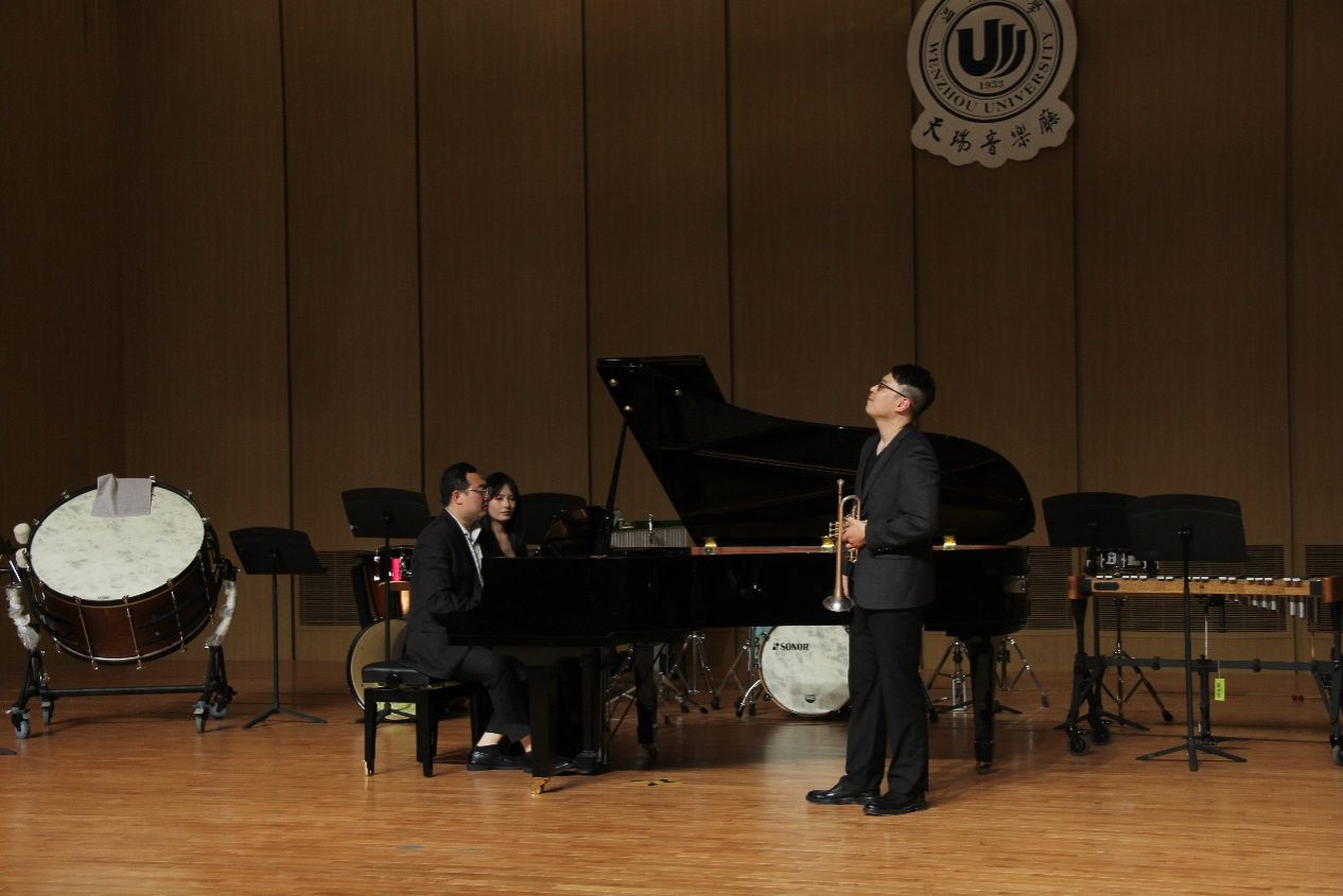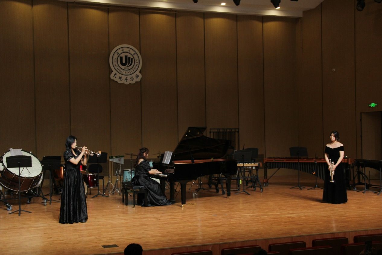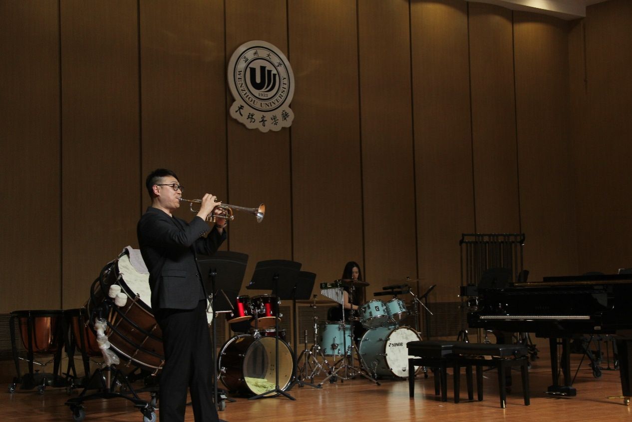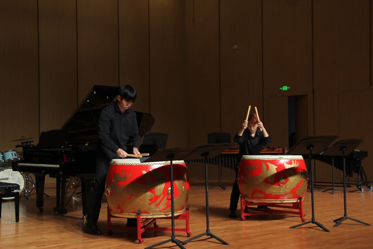 接着是由郑雨同学携钢伴唐声荣同学带来的长号演奏《查尔达什》,这首曲目是由小提琴改编而来,很好地为我们展现了乐器跨界演奏风格。随后尤泽博和朱文静演奏的《牛斗虎重奏》让人印象深刻,给人带来了很强的震撼。紧接着第四第五曲分别是《秋叶》和《伦敦德里小调》,演奏完毕,卢梦滢老师携崔议文、朱文静、朱丽娜等员工带来的《科技先锋》,各种形态的乐器相互配合,相互合作,构成了一个和谐的音乐情景。《节奏之旅》为我们展现了肢体打击乐的表演形式。