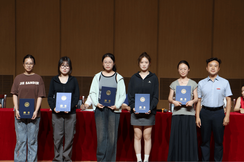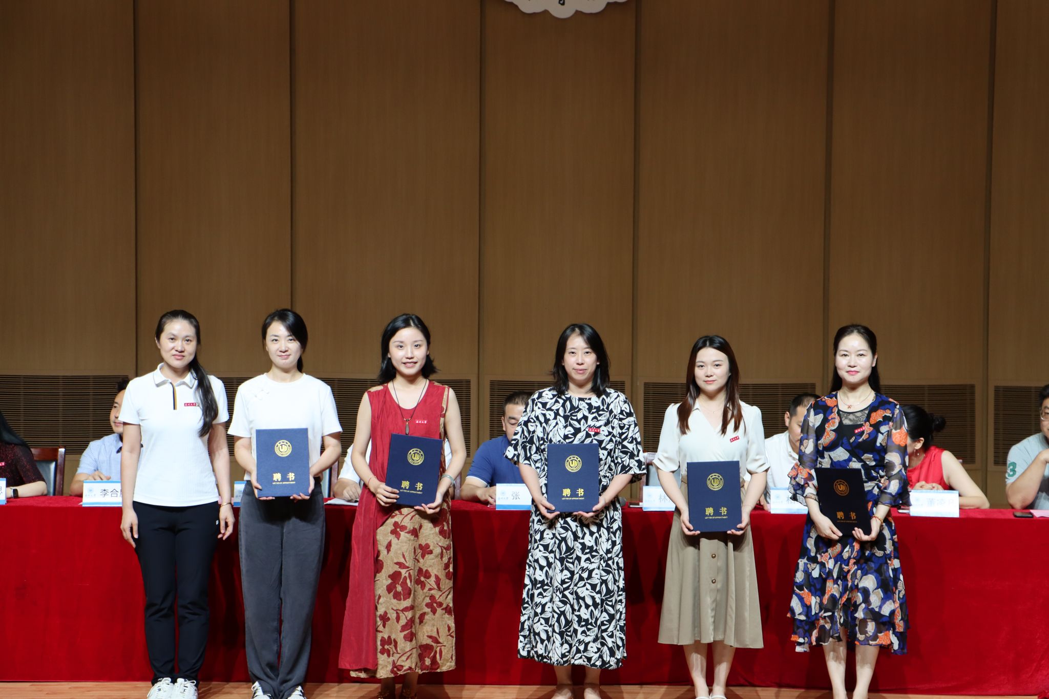 随后进行了新生班主任、班助聘任仪式,6位班主任老师,和班主任助理受聘,副经理张潇潇,党委委员李合胜分别为他们颁发聘书,并合影留念。