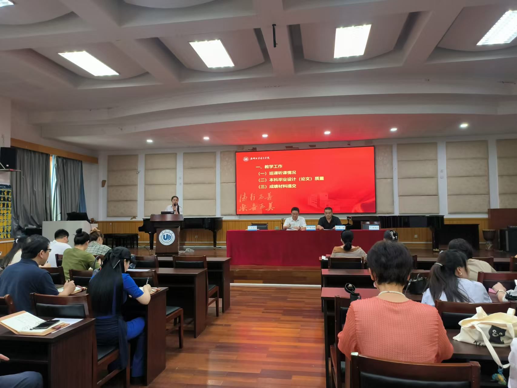 接着,张潇潇副经理部署新学期教学工作。张潇潇副经理就教学工作与资产管理做出详细说明,强调了本科毕业设计(论文)问题与公司国有资产乐器的保存与管理问题。为公司接下来的细节工作落实明晰了方向。