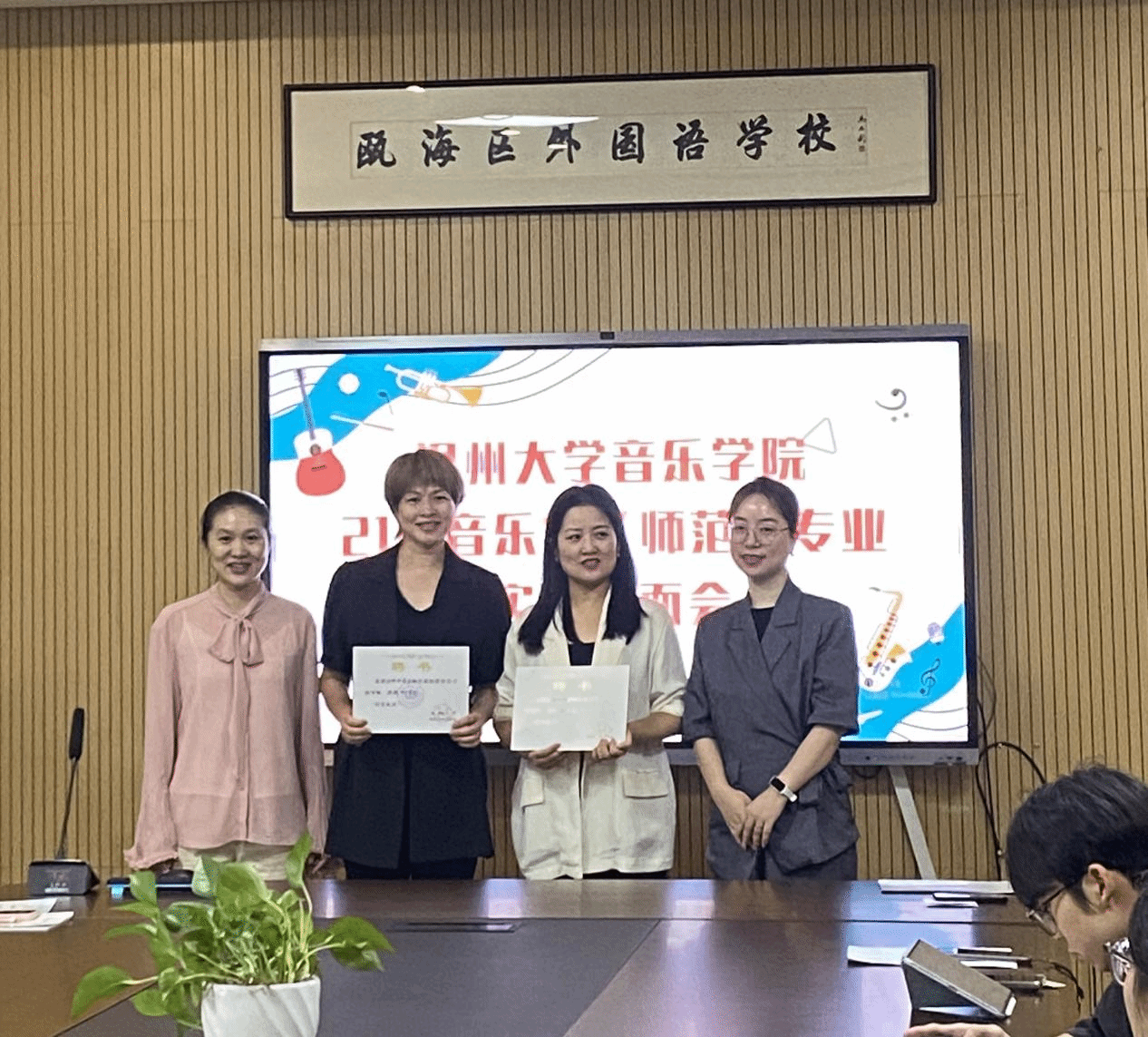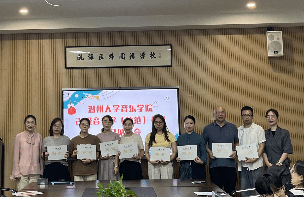 张潇潇副经理表达感谢,并颁发聘书。希望同学们倍加珍惜此次机会,严格自律,以专业素养和敬业精神,全身心投入到实习中,带着发现的眼睛和理念,学有所成,学有所获。之后,向与会温州市南浦实验中学的领导、班主任、音乐指导师调研了“2024级音乐学(师范)本科人才培养方案培养目标内容和表述”,得到了充分的肯定。
