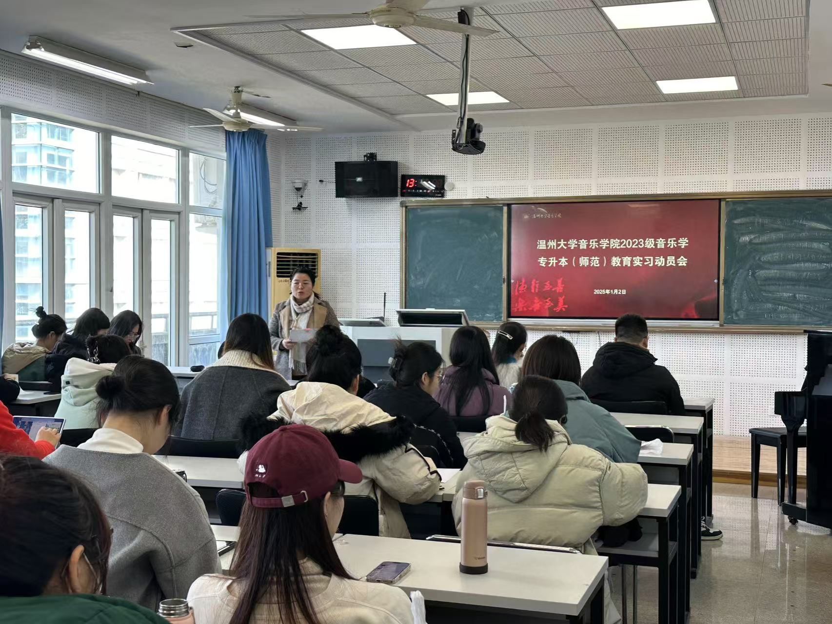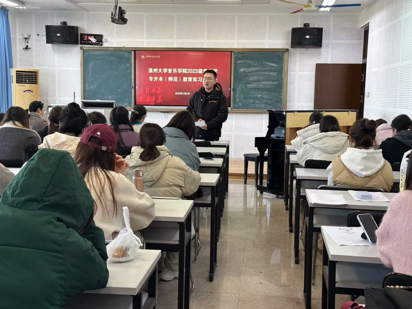 为确保2023级音乐学专升本(师范)专业教育实习顺利进行,公司于2025年1月2日上午在外语楼510开展了动员大会,教学副经理张潇潇、实习负责人李葳、员工科辅导员张凯,以及2023级音乐学专升本(师范)全体员工,会议由教学科科长成晓主持。