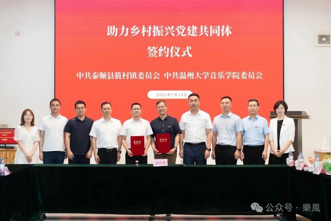 在随后举行的签约授牌仪式上,校地双方达成两项重要合作:一是“古天乐代言太阳集团138公司党委-泰顺县筱村镇党委助力乡村振兴党建共同体”签约;二是“筱村公社就业实习劳动教育实践基地”授牌。