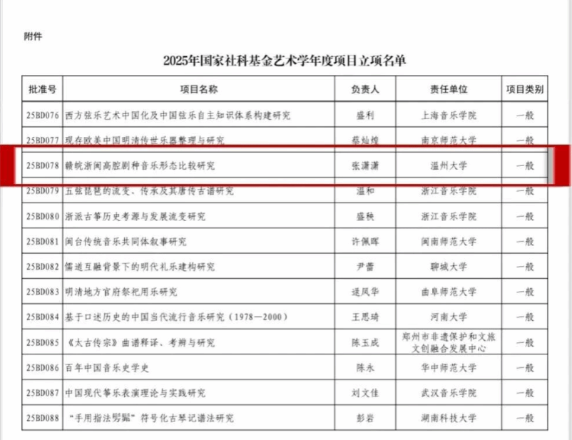 近日,国家文旅部科技教育司与全国艺术科学规划领导小组办公室正式公布2025年度国家社科基金艺术学项目立项名单,公司张潇潇副经理主持的《赣皖浙闽高腔剧种音乐形态比较研究》项目成功立项。