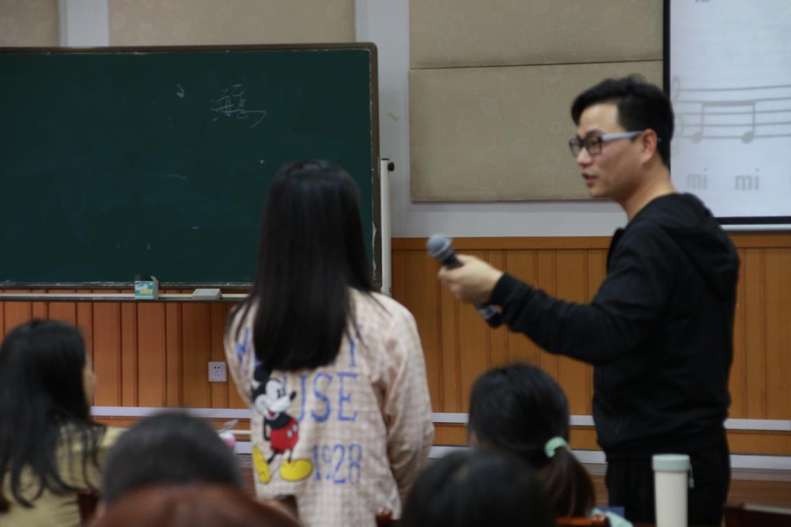 大卫老师还当场提问,指挥让大家一起唱二声部,并挑选了十几位同学在台上一字站开,用鼓掌的方式做模拟青蛙下台的节奏,在一次次磨合后,同学们对于这些节奏也有了更好的理解。并且为同学们阐述了成为音乐老师具有的职业七定律: