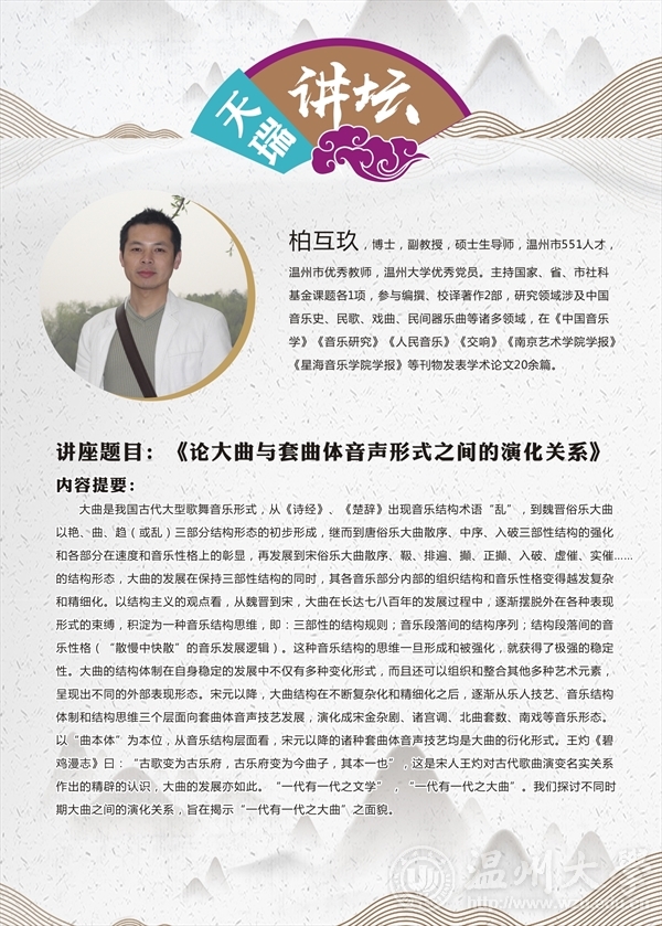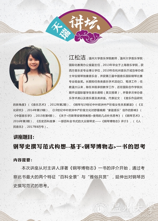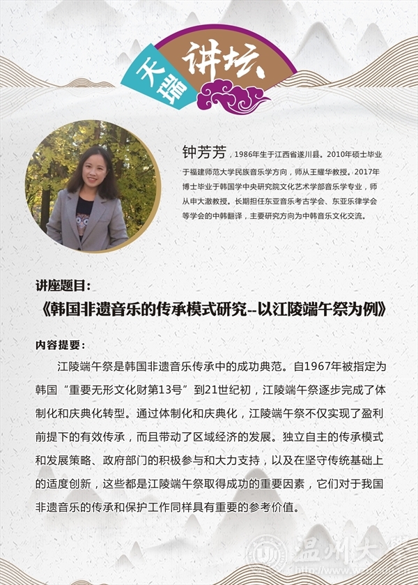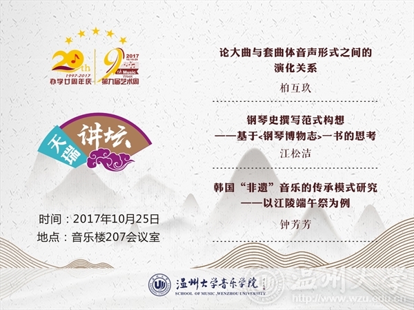 首先,江松洁老师为我们带来了《钢琴史撰写范式构想》的讲题,她向在座的听讲者讲述了她如何翻译和理解“natural history”,并且分享了《钢琴简史》、《不朽的钢琴家》、《钢琴家大词典》、《男人女人和钢琴》等多本著作。她将自己所翻译的几个章节“钢琴热”、“首位钢琴巨星”向听讲者分享,并赞美了该作者非“打包式”的叙述。接着,钟芳芳老师带来了《韩国非遗音乐的传承模式研究》的讲题,她以“江陵端午祭”为中心,她说:“江陵端午祭主要祭祀的对象是山神,且祭祀地点就只有江陵这个地方。”该讲题也为听讲者拨开了前两年韩国申请“端午”成功的迷雾。同时也分享了韩国的传统文化以及在祭祀端午时音乐的传承。随后,柏互玖老师的员工带来了柏互玖老师的讲题《论大曲与套曲体音声形式之间的演化关系》,该讲题从乐人技艺、音乐结构体制、结构思维这三个层面论述了大曲向套曲体音声形式之间的演化关系”。并且柏老师的员工与大家进行深入交流。