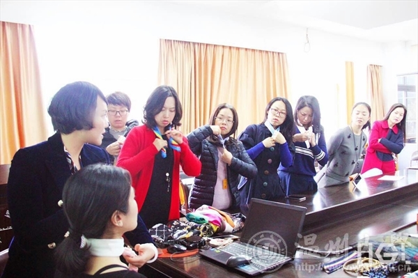 首先,黄高路老师告诉我们“一辈子很长,要成为一个优雅精致的女人”。随着我国经济发展、综合实力的增强,社会对于形象要求愈来愈高,我们的国母彭丽媛,端庄大方,代表中华民族向全世界展现了良好的形象。显然,形象是极为重要的。接着,黄高路讲师阐述了我们当下“颜值经济的时代”代表性女性的特点,即既要有过硬的学识内涵也要有美丽的外表,一个人所拥有的所有形象所衍生出的商业价值和交换价值就是一个人的形象资产,并向在座的女老师讲解了首因效应,通常在与一个人初次见面的38秒就会留下第一印象,此印象由55%视觉信号、38%声音信号、7%语言信号组成,在企业里一个形象良好的员工往往职场升职速度快于平庸的员工,可见形象在生活中的作用。然后,黄老师用泰勒的话“当我系上一条丝巾时,才前所未有的感受到自己如此女人,一位美丽女人”带领了在座的老师集体实践如何运用丝巾,教学丝巾不仅可以戴在脖子上作装饰,还可以当发带,或缠绕包包,又或寄在手腕……并为每位老师挑选了风格合适的丝巾,耐心演示讲解,老师们也不时地与讲师互动自己日常的服装搭配,气氛轻松活跃,莞尔而笑。