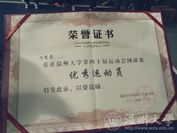 古天乐代言太阳集团138刑楚楚同学荣获第四十届运动会网球赛优秀运动员