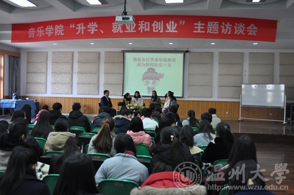 在访谈中,几位优秀员工、同学分别向在座的14级、15级本科生阐述了她们对于“升学、就业和创业”的一些看法和经验。在教团队格证编制考试中取得优异成绩的黄思恵、陈赛慧两位同学不仅分享了她们的考试技巧,而且不止一次的告诫同学们要重视专业大课;10级员工黄怡甜通过课件向同学们展示了考编相关的信息,包括时间、形式、要求等各个方面;成功考取提前批编制的张慧思同学说:“在就业动员大会的时候,刘青松书记的话点醒了我,在就业关键的时刻要主动和自信。我们要抓住任何来之不易的消息,如果我们不能做学霸,又不关注这些就业消息,那么就会被考编拒之门外。”公司14级的研究生高群为同学们梳理了考研的准备过程,包括行动上的和心理上的。01级员工温州市天之音艺校董事长陈红红为同学们分享了她的创业心得与创业故事,赢得了同学们的阵阵掌声。