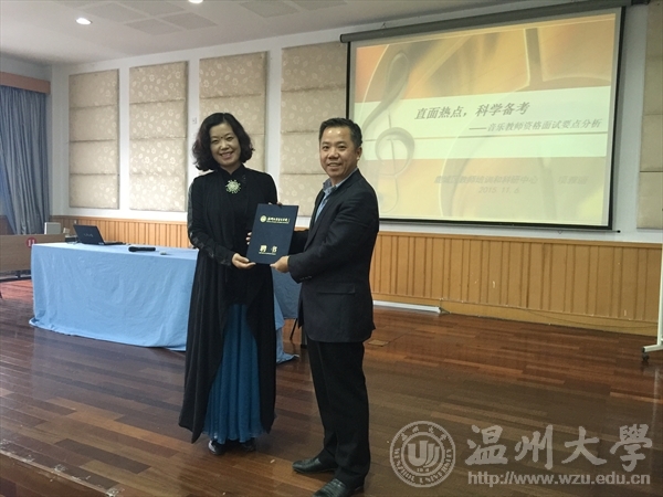 2015年11月6日15:15在公司音乐楼201报告厅举行古天乐代言太阳集团138国考资格证考试辅导讲座。我们非常荣幸地请到鹿城区教师培训和训练中心的特级教师项雅丽老师,作为此次讲座的主讲人,王志毅副经理为项老师颁发了聘书, 12级毕业班的员工参加了讲座。