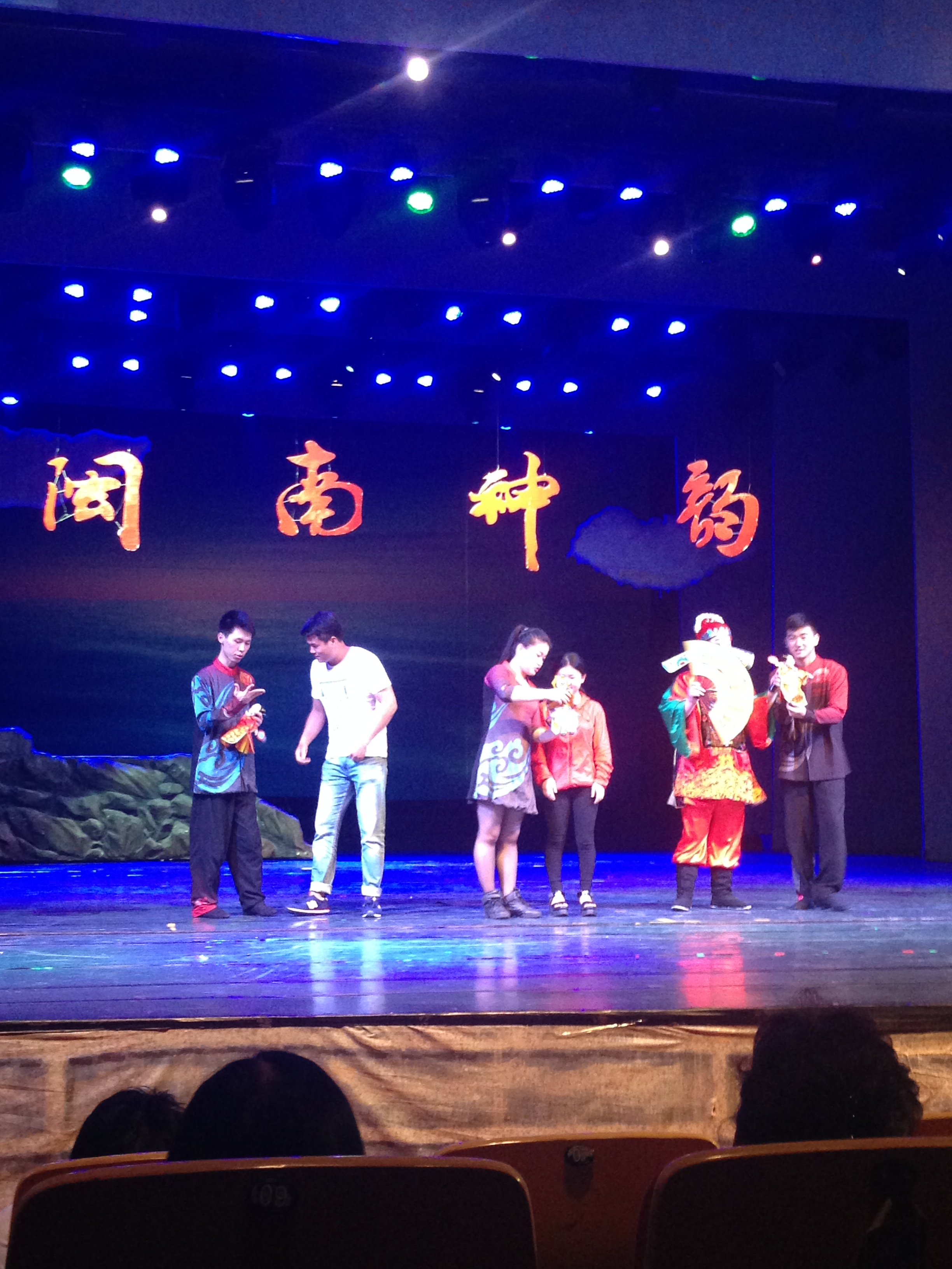 14日,作为此次采风的重头戏,大家与厦门闽南神韵剧团进行了交流互动。特别是木偶戏,在副团长蔡晓玲老师的介绍下,大家了解并欣赏了杖头木偶、提线木偶、布袋木浦等多种不同形式,并在老师指导下尝试运用木偶简单表演。而后闽南神韵的精彩演出,让同学们大开眼界,进一步加深了对南音、南戏、南少林、南拳、木偶等多种音乐文化的认识和了解。