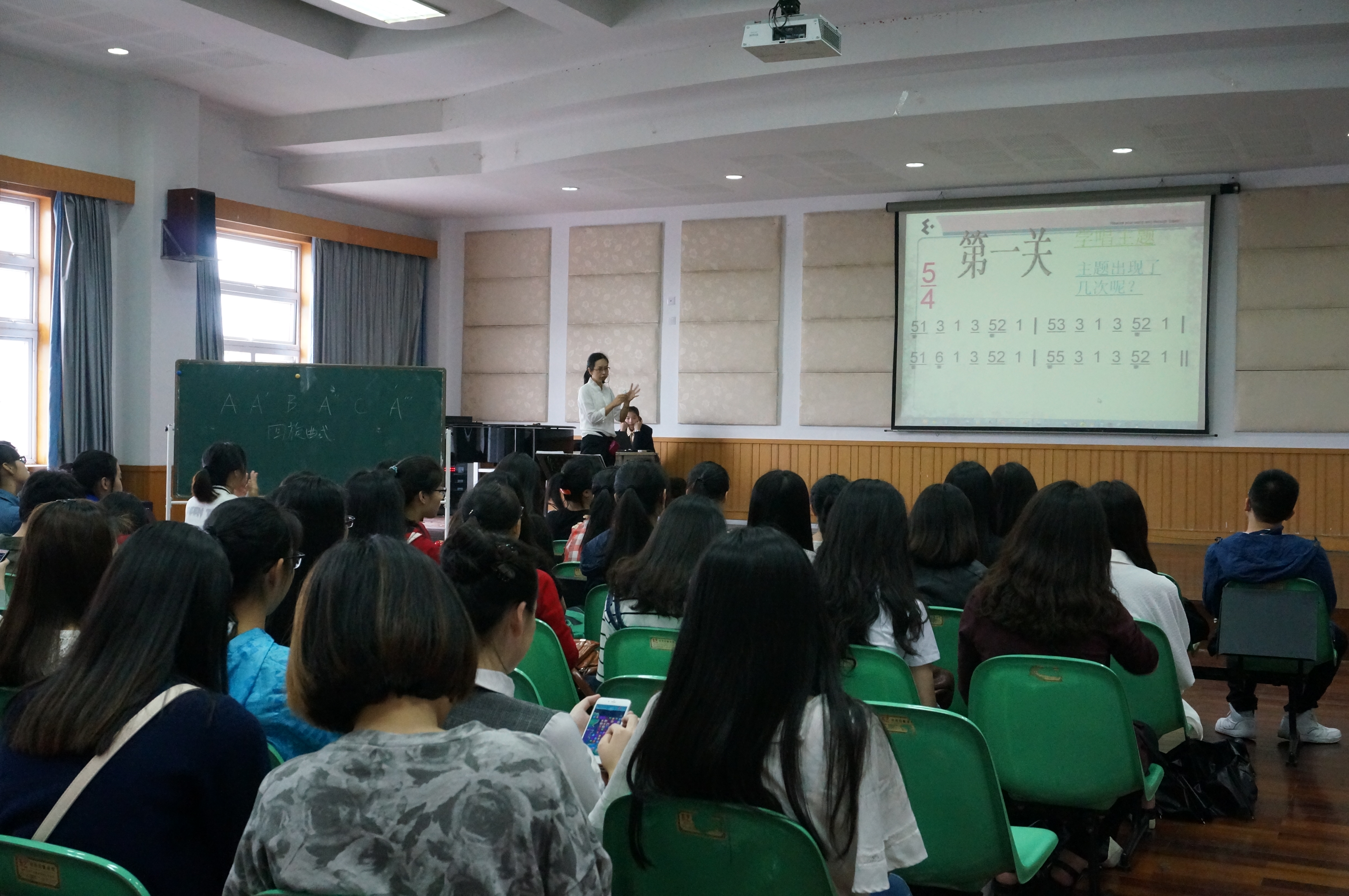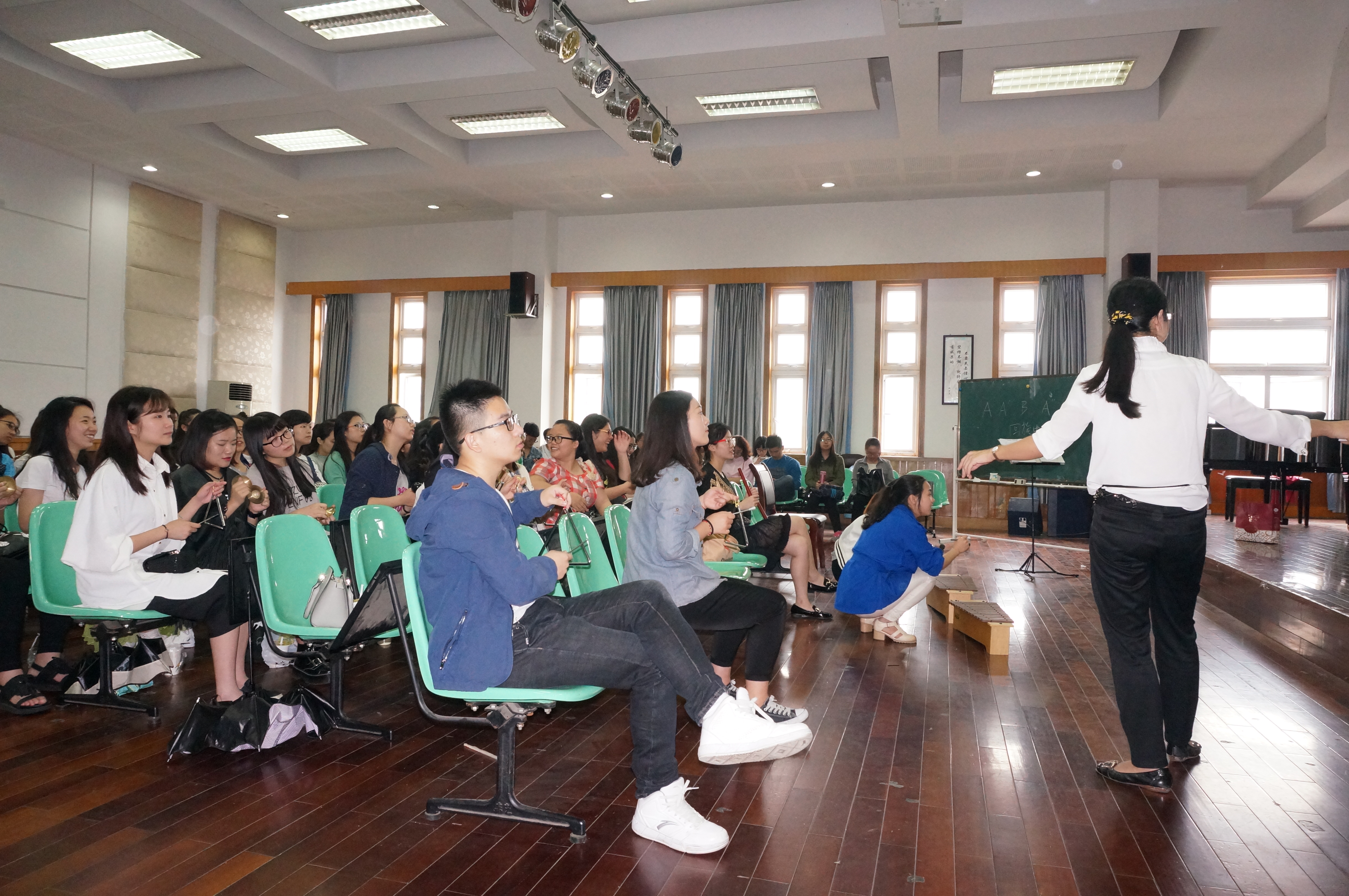 2015年5月11日,实践周第一天,公司理论教研室李葳老师的公开课于当天上午9点在音乐楼201学术报告厅举行。李老师以《欣赏教学方法探索》为题,提出并实践了她在教学实践中总结出来的十六种欣赏教学方法。并组织12、13级音教专业的员工,参与到生动的“律动”教学之中。