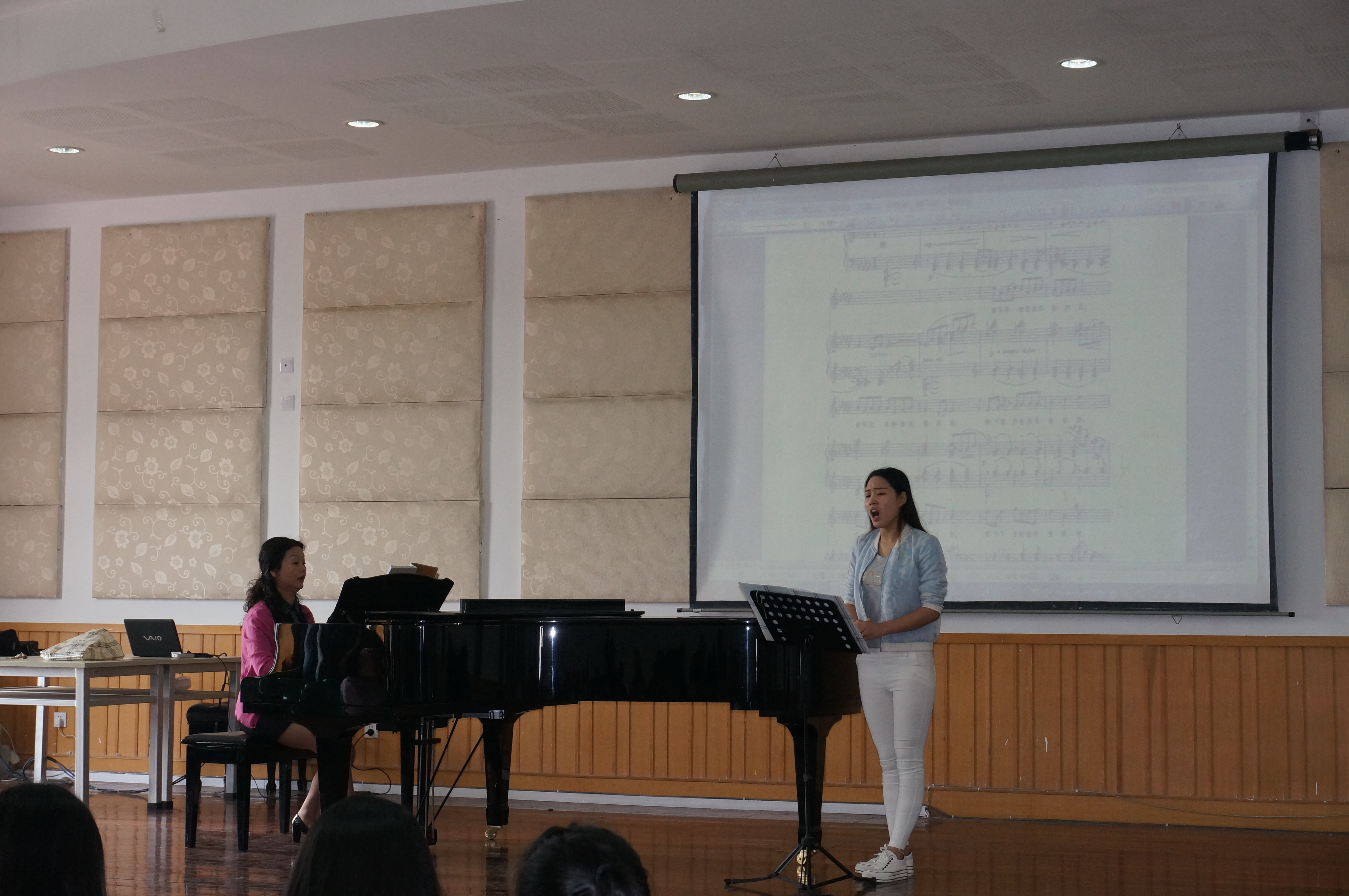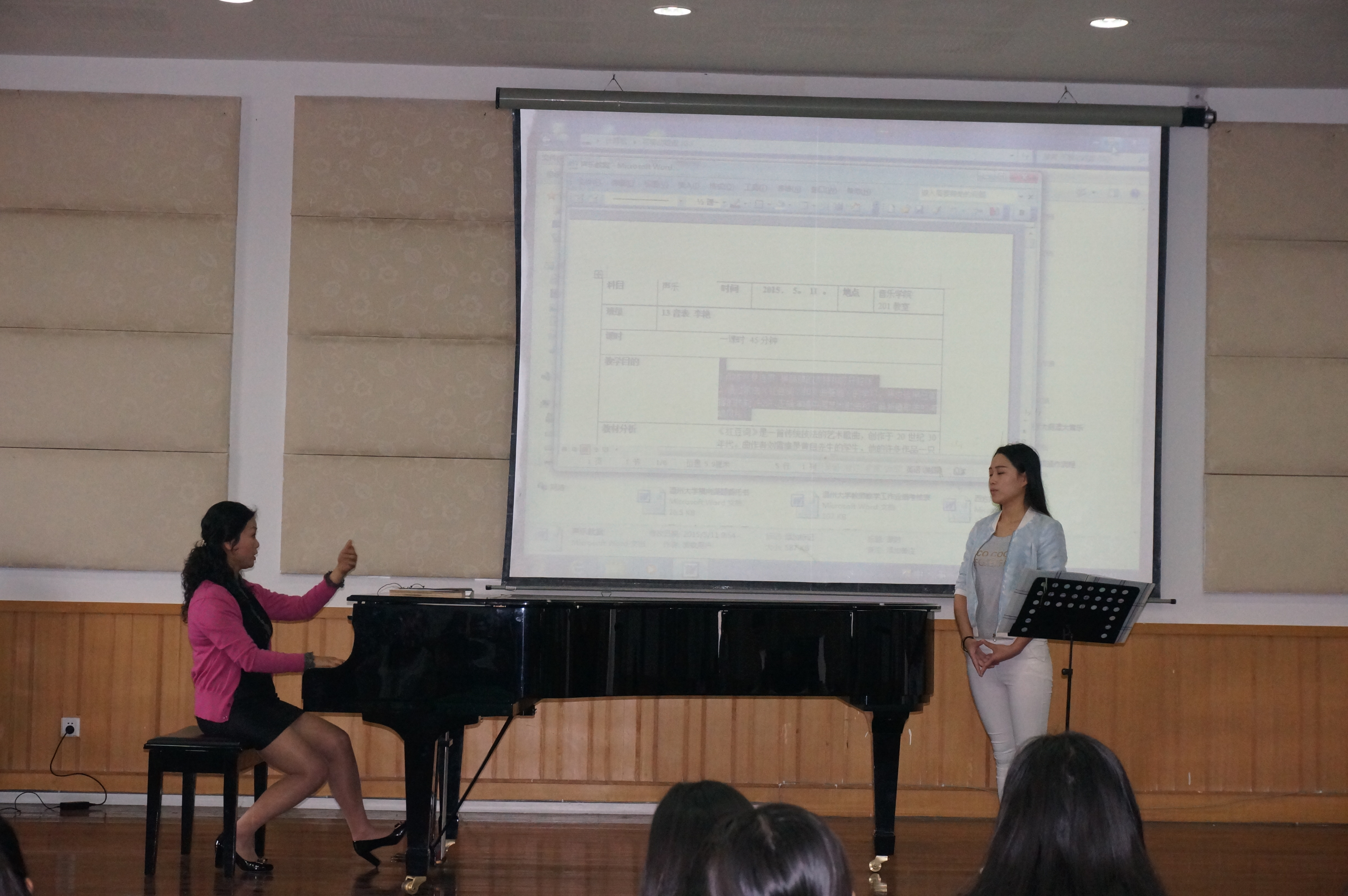 2015年5月11日10:40分,声乐教研室赵群英副教授的《声乐》公开课,在音乐楼201学术报告厅举行。声乐教研室及理论教研室的部分老师参加了该活动。课堂上,赵群英老师为12级员工李艳分析、示范了《红豆词》。赵老师的讲解细腻、分析准确、示范到位。