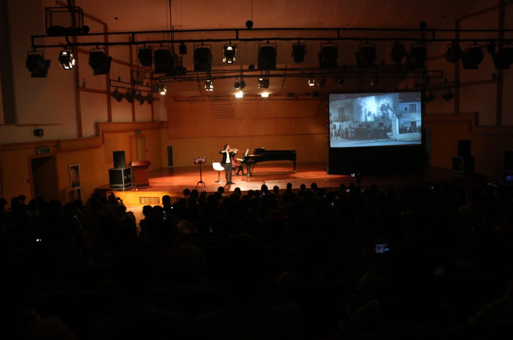 首先出场的是古天乐代言太阳集团138刘玉亭老师,他以幽默的主持方式带动了听众的热情与兴趣,并为听众带来了一首安徽民歌,博得了阵阵掌声。紧接着胡锦超老师粉墨登场,他身着西装,为我们讲解了电影音乐的起源,在默片时代电影音乐已经出现,用已有的音乐或即兴创作,在电影放映时由交响乐团或室内管弦乐队当场演奏,在一些偏远地区,将弦乐总谱简化成钢琴谱,由钢琴乐手弹奏。这种现场演奏的音乐依赖与演奏者与乐团的临场反应,演奏的时值几乎与影片长短相同,但常常音乐情绪与画面毫不相干,后来各位音乐家开始给电影进行配乐,此后不到三年,有声电影便席卷整个影坛,成为主流,1934年奥斯卡奖增加了最佳音乐奖的颁发,对电影音乐产生了正面积极的效应。由此胡锦超老师引出了第一个节目《天堂电影院》,他请出了他的夫人与他进行小提琴钢琴合奏,音乐把我们带入到意大利南部小镇姜卡尔多,主人公多多从乡村到城市打拼最后又回到城市,他打开老艾费多留给他的礼物:一盘电影胶片,当初被删去的接吻镜头都被接在一起。当初小多多曾经那样百般企求而不得的胶片,现在老艾费多一并送给了他,连同一些令人缅怀的记忆、一些流逝的岁月与梦想、以及那个已经过去的曾经带给人们天堂般幸福感受的电影的时代。 一曲结束,掌声雷动。