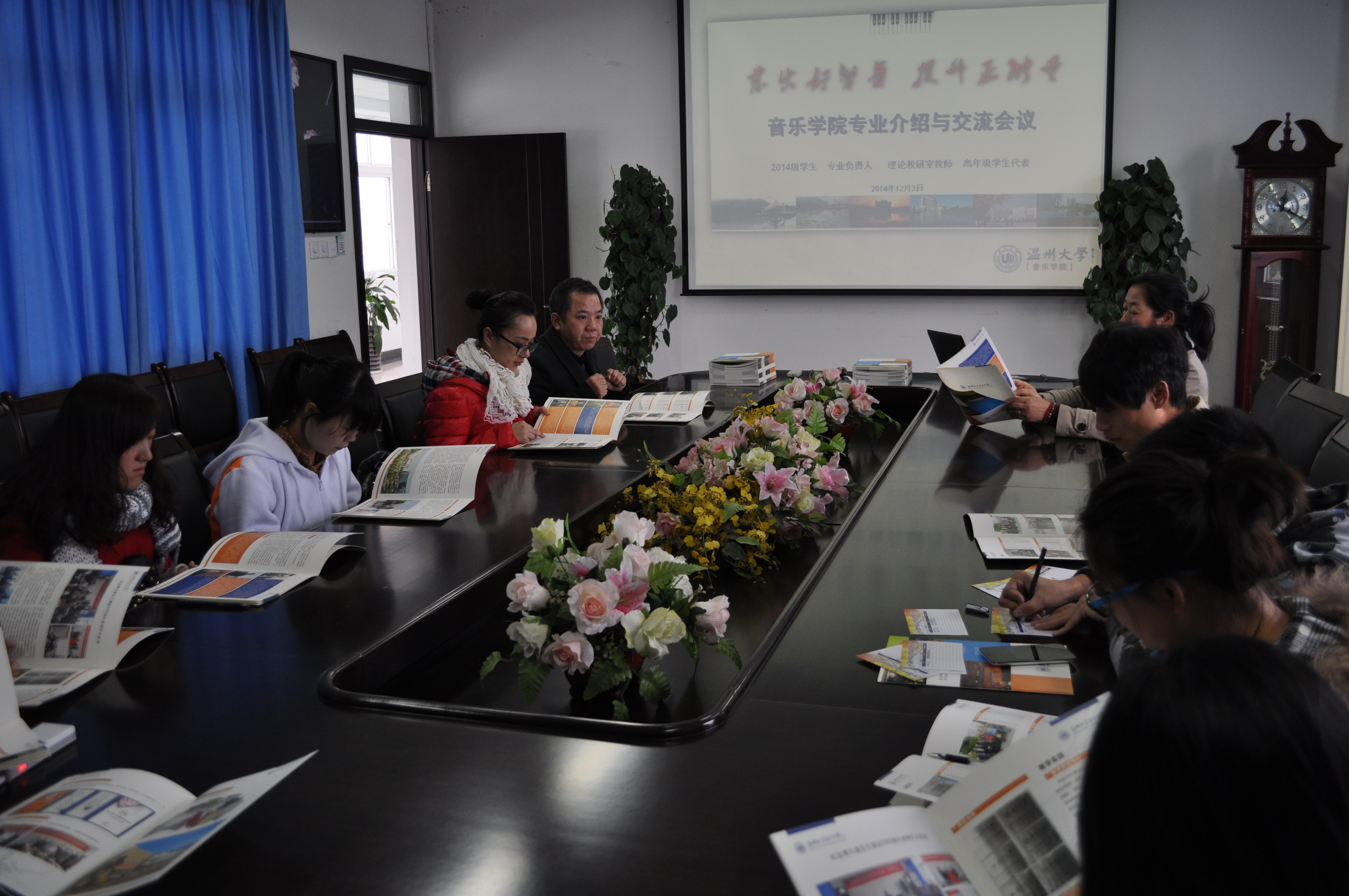2014年12月3日下午,2014级新生专业介绍与交流会议在音乐楼309召开。参加会议的有14级新生、专业负责人李晓燕和王文韬老师。理论教研室的柏互玖、乔志亮、杨古侠、王志毅、邓深海、江松洁等六位老师及高年级员工代表刘慧群同学。会议由副经理王文韬主持。