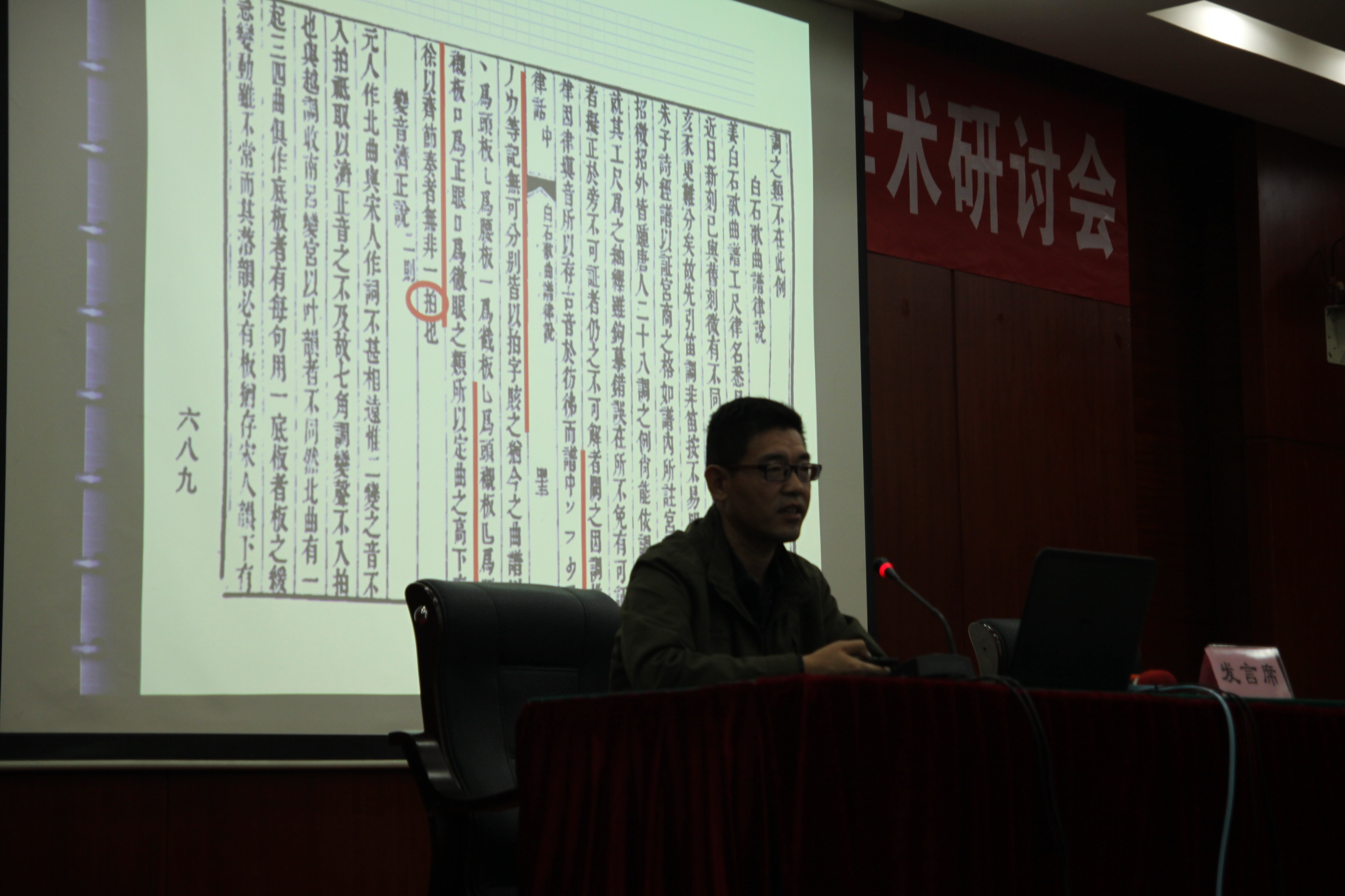 公司赵玉卿教授主持了16日上午的研讨会,并在大会上作了《姜白石俗字谱歌曲译谱之节奏研究》的学术报告。南宋姜夔《白石道人歌曲》对俗字谱的研究具有重要的史学价值,但在学术界中在译解姜白石俗字谱歌曲的节奏节拍方面仍存在着不少分歧。在学术报告中,赵玉卿教授梳理了姜白石俗字谱歌曲之节奏方面的研究观点,在此基础上提出了“一音一拍”“均拍”的新观点。赵玉卿教授认为对白石道人俗字谱歌曲研究之节奏的译解应以“一字一拍”为基础,采用“均拍”的观点划分小节,这样的译解方式更加接近白石道人俗字谱歌曲的原貌。在赵玉卿教授学术报告中提出的新观点引起了在座专家学者们的广泛关注,产生了较大的学术影响,得到了专家们的一致好评。