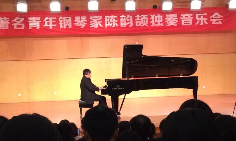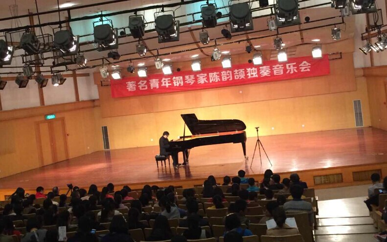 由于只出演一场,音乐厅内座无虚席。大家用了最热烈的掌声有请陈韵劼老师上台。这位钢琴家微笑着走向舞台前面,鞠躬。开始了他的音乐会,第一首是被誉称为“音乐神童”的著名作曲家莫扎特的D大调回旋曲。此曲极具感染力,热情奔放的旋律洋溢于空中,缠绕整个心间,给人以无限的回味和遐想!斯克里亚宾第三奏鸣曲op23,又名《精神状态》。在陈韵劼老师的演奏下,大家准确的听出了第一部分的戏剧化,第二部分中段的轻柔,第三部分的B大调行板,第四部分以回旋奏鸣曲式结束的四个乐章。接着陈老师又弹奏了李斯特驰名的《匈牙利狂想曲6》,全场氛围再度火热,听众都抱着鲜花送给陈老师。中场休息时,大家都赞叹陈韵劼老师精湛的琴技。在大家的满怀期待下,陈老师为听众带来了卡尔·凡恩《奏鸣曲》。Carl•Vine是澳大利亚当代作曲家,听他的音乐,相当于脱下职业套和淑女装,换上了青春时尚靓丽款。有点另类,却又不特别前卫,有点随心所欲,但一点也不嚣张,陈老师的弹奏恰到好处,就是这种感觉。此外陈韵劼老师弹奏的拉威尔《帕梵舞曲》带给大家幽灵澄空的感觉,李斯特《梅菲斯特舞曲》和《匈牙利狂想曲2》分别表现了活灵活现的魔鬼的形象和独树一帜的风格,深受听众的喜爱。本来音乐会到此就要结束了,但听众们不断要求再来一曲,呼声一波接一波,陈老师稍后满足了大家的愿望,欢呼声震耳欲聋。李斯特的《钟》深刻的让大家体会到了陈老师极其高超的钢琴技巧,肖邦的《黑键》在演奏技术上有着相当的难度,音乐充满迷人的光彩,由快速的三连音一气呵成,就像一串晶莹的珍珠在轻盈地跳跃和滚动,其中隐约可见的主旋律也流露出活泼、嬉戏和孩子的天真,使人从中感觉到无比生动的情趣。陈韵劼老师的手指展示着伟大钢琴家与听众之间那种神秘的默契。这种默契正是音乐最迷人之处。任何艺术形式都没有音乐那种震撼灵魂的力量。在浩瀚的音乐世界,钢琴家的魔力是无可匹敌的。