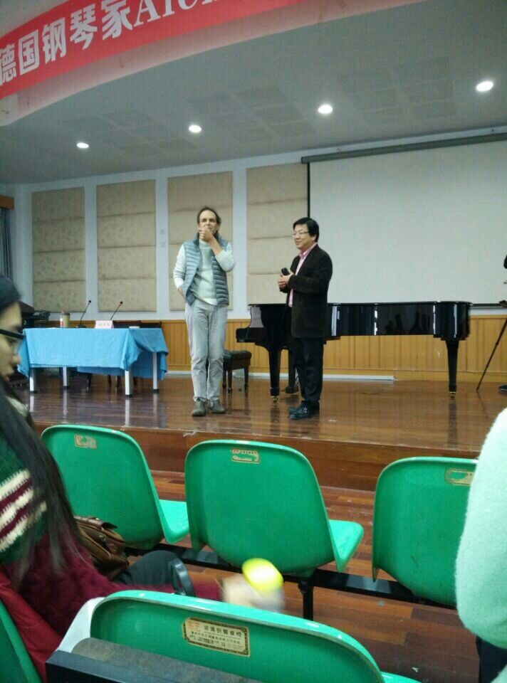 刚进学术报告厅,德国钢琴家Alexander Bildau就等在此处。首先,由张中灿老师介绍了此次讲座的主要内容,首先,1900年前后浪漫主义以后步入近现代音乐的发展,其次,人的耳朵用来培养 ,追求更新的东西 ,最终既是伟大的作曲家对摆脱调性的贡献。ALEX首先弹了一首曲子,曲子深沉,混浊,没有旋律感。这首曲子是李斯特作曲的《灰色的云》,曲子有两个特点:一是两个低音安排在同一个踏板上。 其次曲子的最后不回到主和弦上,保持张力,但没有解决。ALEX说到,不能以一个作曲家的某一个作品就定作品风格,因为一个作曲家从最初到最后,风格会大变。说到贝多芬创作风格的变化,以及国家之间风格的差异。接着,又弹了一首德彪西在1904年的作品,这首曲子中,德彪西进行了远离调性的尝试,主要有两种方式:全音阶和平行五度。 在当时并不会这么做,差不多所有的和弦都是平行五度,然而现代的流行乐中就有很多平行和声构建。接着他又弹奏了一首1909年,匈伯格的曲子,此曲在当时还没有建立十二音乐体系,这首曲子不用原来的作曲方式,曲子始终保持张力,并且有传统的引子,刚开始能找到调性,以后曲子改变音频,就找不到调性。音乐没有好坏之分,我们的耳朵具有选择权,经过自己努力了解的音乐才会更长久。