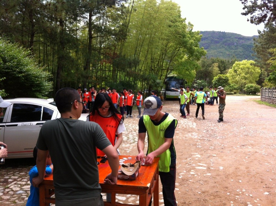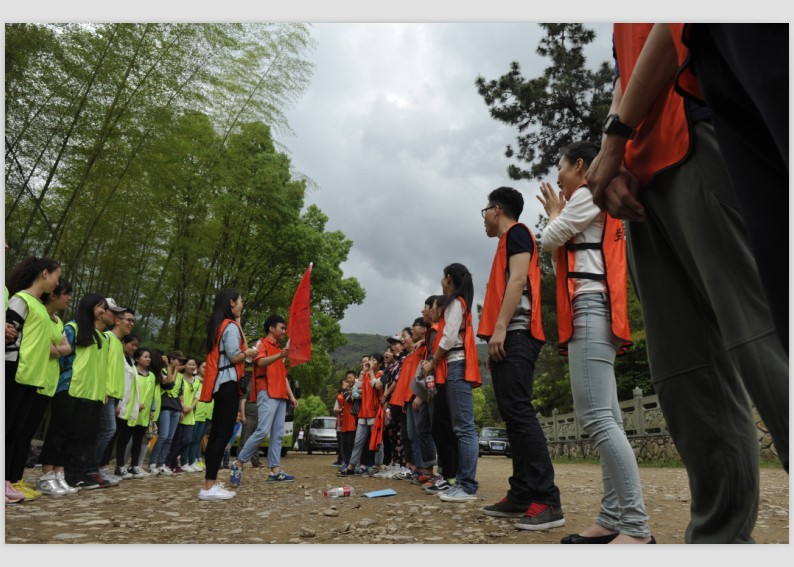 4月27日上午9点整,员工干部到达了楠溪江。在总培训师的号令下,我们进行了一项简单的素拓任务,目的旨在让大家熟悉培训的基本内容及彼此熟悉队友。接着我们分成了2个素质拓展队伍,并分别配备至少一名培训师进行了一系列的户外培训。