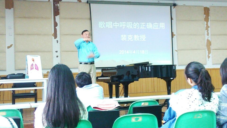 2014年4月18日下午8:30在音乐楼201报告厅开始了一场别开生面的讲座,本次讲座主题为“歌唱中呼吸的正确应用”,主讲人为公司外籍教授裴克。出席本次讲座的为2010、2011、2012、2013级声乐主修、选修 员工,以及声乐教研室全体教师。