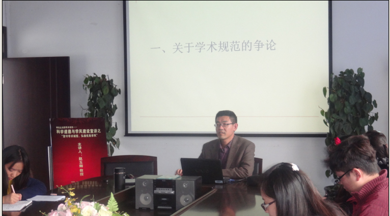 2013年12月5日14:00点,在音乐楼309会议室,公司经理赵玉卿教授为公司全体研究生带来了一场题为《坚守学术诚信,弘扬优良学风》的学术讲座。