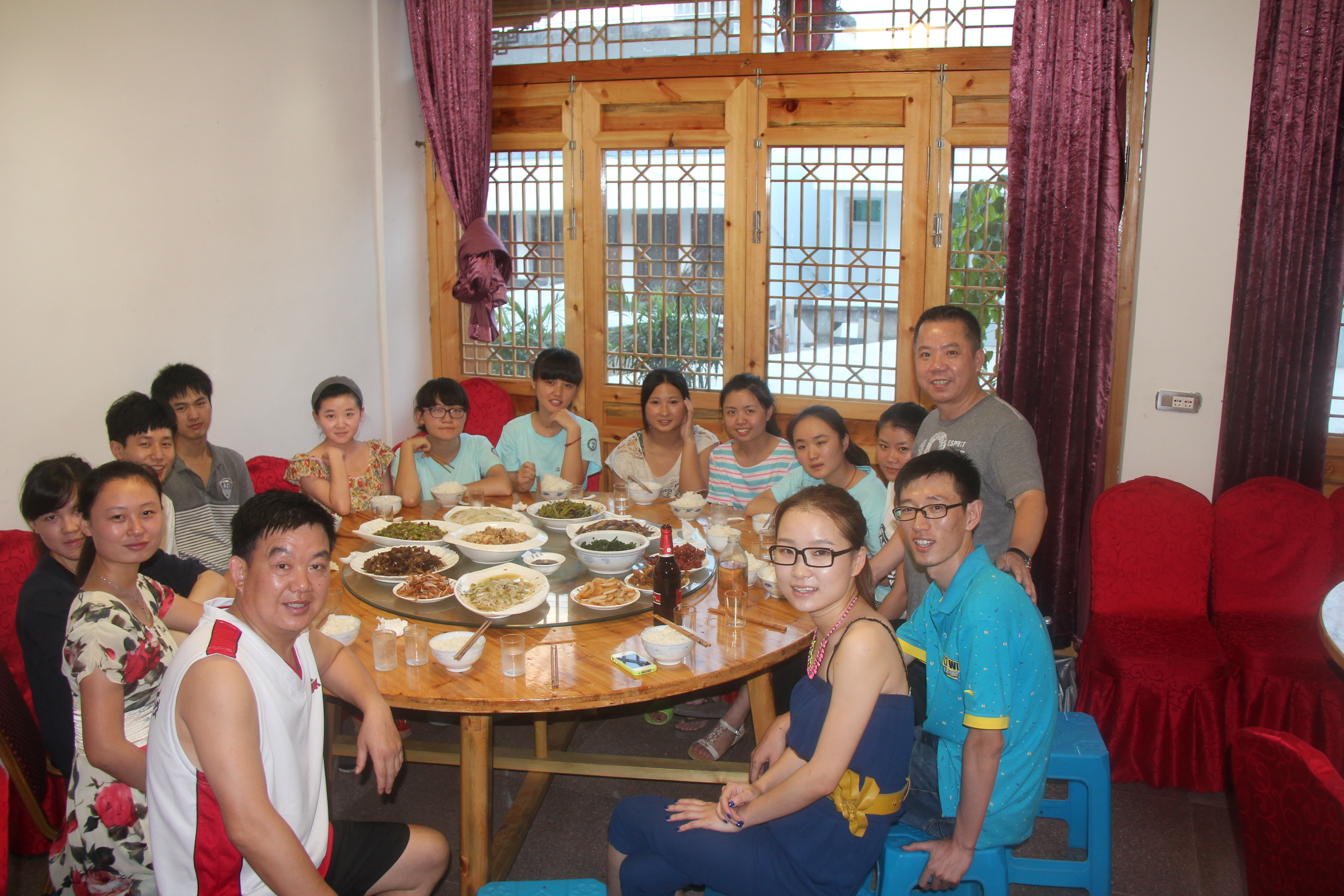 为了答谢村长、书记、旅店老板对我们的照顾,我们全体员工和老师准备了一顿丰盛的答谢午餐,我们邀请了村书记、 村长和副村来参加我们的答谢午宴。午宴显得十分热闹,我们还特别邀请了爷爷奶奶两位寿星来参加。在欢笑声、鼓掌声和碰杯声中,我们度过了欢乐的早餐时间。明天我们就要离开这段时间陪伴我们的畲族村了,我们非常地舍不得,虽然只是一段时间的日子,但是我们学到了更多,获得了更多。今晚的老师,不是以老师的身份和我们在一起,而是好朋友的身份一起吃饭,这让我们感到非常地轻松,所以我们向两位老师致敬!