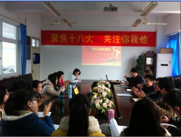 会上,主持人还通过PPT形式解读了十八大报告的精髓,并以小组形式将支部成员分三组对十八大报告中的经济政策、就业形势、生态文明等问题进行讨论,支部成员积极响应十八大精神:一方面对当前的就业状况进行了大致的分析,并就如何应对当前的就业形势作出了相应的挑战方法;另一方面各小组代表皆谈到了“空谈误国,实干兴邦”的理念。通过小组讨论发言,支部成员不仅从理论上对十八大精神有了深刻的解读,而且实践方面各小组也提出了响应十八大精神行动策略。