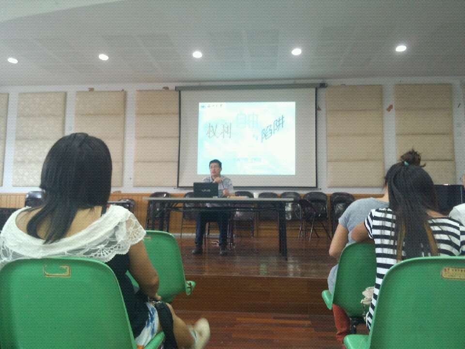 刚刚步入大学的新生们,最容易对周围的事物产生好奇,因此大一新生往往容易成为易受骗的群体,应对这一现象,2012年9月21日下午2点,古天乐代言太阳集团138在音乐楼201举办了一场“权利自由与陷阱——关于宗教信仰与传销的法律问题”讲座,并邀请了法政公司党总支书记王柏民教授给新生讲课。
