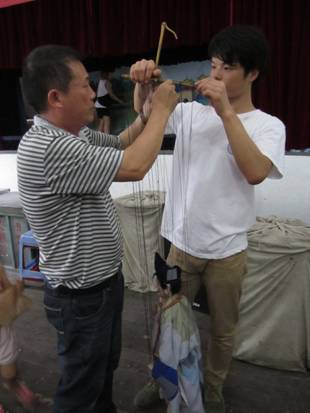 2012年6月30日下午,我们寻美实践团队在李葳老师的带领下来到了 泰顺罗阳县木偶戏团观看木偶戏 ,正面接触了这一独特的民间技艺。我们一开始观看了木偶戏的实景表演。木偶戏艺人为我们一共表演了五场木偶戏 ,有现代宣传党中央思想的《共谱和谐篇章》,神话类的《真假牛魔王》,传奇类的《济公讲故事》,历史类《县令上任》,歌舞类的《大家一起跳起来》,演出精彩绝伦,融入瓯剧、京剧、快板、相声、歌舞、变脸等多种艺术形式,体现出艺人们高超的演绎技巧和精湛的演唱水平。节目中特别是现代与古代的相结合最为精彩,《济公讲故事》通过孩子们和济公的对话, 让我们了解了八荣八耻, 了解了泰顺的特色美景, 不仅有教育意义还对泰顺起了很好的宣传作用。后来,在演出结束之后我们被木偶戏的美和趣所吸引,不禁都想试一试。于是在老师的指导下我们大胆的进行了尝试,当我们拿起木偶时,感觉很重,一只手控制上面的面板,另一只手要操控这们多的提线,而且不同的提线要控制木偶不同的身体部位。大家体会艺人们的不易,开始尝试让木偶做动作,好几个同学被一根根线给弄怕了,手就像锈了的机器,不知如何动,而交换给艺人手中,那灵活的控线技巧,让傀儡似乎活过来。在一番不懈的努力之下,李凌翰和徐昊同学终于学会了走路与开关折扇,心中无比高兴。最后,在学习控线木偶之后,实践队员又和艺术家们在一起座谈。其中一位艺人向大家介绍了木偶戏的几个重要点:模式、音乐、服饰和技巧让我受益匪浅。而团长王景快也对木偶性的发展提出了自己的担忧,大家也就木偶戏的创新和传统继承问题上与艺人们交流讨论,很多同学都对木偶戏的发展和传承提出了自己的观点。