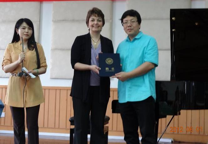 NOSIKOWA教授在上大师班前,演奏了一首李斯特根据瓦格纳的早期作品改编的钢琴曲,她精彩的演奏和风趣的教学,赢得了老师和员工的阵阵掌声。公司李杰鹏经理为NOSIKOWA教授颁发了兼职教授的聘书。