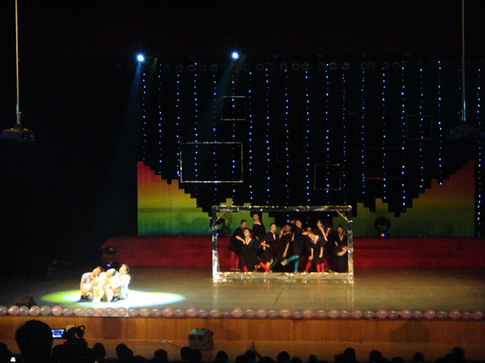 演艺厅激情飞扬,舞姿动人。随着舞台的幕布缓缓拉开,08舞蹈班的美女手戴荧光圈,闪亮登场清一色的黑色热辣舞服强烈冲击着观众的眼球,在灯光的渲染下,展现了一群青春活泼的舞者。风趣搞笑的群舞《毕业狂想曲》,他们身着毕业学士服,每人以自己独特的风格跑上舞台,诙谐的动作,风趣的表演,引得台下观众阵阵大笑。三人舞《无猜的回忆》又把大学期间校园里的三角恋关系表演得淋漓尽致,编导贺捷频老师为了这个舞蹈也下了不少功夫。芭蕾独舞《C est la vie》,更让人赏心悦目,薛倩雯同学修长的肢体,优美的动作,挺拔的气质,那种优雅,让人领略到了足尖芭蕾的魅力。四人舞《大女生的小往事》表演者孙莹莹、宋晓倩、徐韦和袁诗雯,她们四个把女生平时的学习,生活融入到舞蹈当中,通过表演一些故事情节,从而表达08舞蹈这个班级间真挚的感情与浓厚的友谊。男子三人舞《孤鸿》尽显古典魅力,表演者李孔鑫、陈书吉和赵书宾身着古典飘逸舞服,单腿跪在舞台,等待情绪的抒发。舒缓的音乐从两边缓缓流出,他们以轻快的舞步,柔和的舞蹈动作演绎着鸿雁,中间音乐一转,进入高潮,他们以旋转、跳跃,翻腾等高难度技巧神情饱满地表演孤鸿是如何飞向属于自己的蓝天。