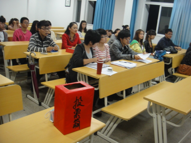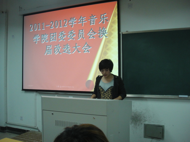 本次换届改选大会于2011年11月4日晚18:30在外语楼406室进行。院员工科副科长、团委书记叶如芳老师,辅导员向伟老师,团委副书记蓝柳燕同志出席了本次大会,员工会主席潘椿年同志,副主席吕柳慧同志列席会议。原团委副书记蓝柳燕同志组织带领与会团员学习团委的工作职责并代表上一届团委作了工作总结报告,全面、客观地回顾了上一学年共青团工作开展情况,明确了今后一个学年团委工作的总体要求和主要任务。
