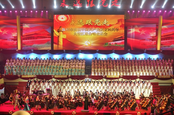 6月26日晚,红旗飘扬,“永远跟党走“温州市庆祝中国共产党成立90周年大型红歌合唱音乐会”在温州市体育馆隆重举行。公司师生近百人参演了合唱音乐会。