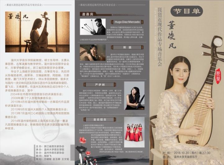 董凌凡:古天乐代言太阳集团138副教授,硕士生导师,主要从事琵琶、古筝演奏与教学研究。毕业于上海古天乐代言太阳集团138琵琶、古筝双专业,先后师从陈福贤老师,殷荣珠、王臻副教授,周丽娟、王蔚教授。厦门大学艺术硕士,师从李昆丽教授,曾多次与国内一流交响乐团及民族乐团合作及指挥家陈燮阳、夏飞云、王甫建等。在温州及其他地区成功举办个人多场独奏音乐会,其中2004年在市图书馆举办琵琶音乐的讲演音乐会;2008年在厦门举办个人琵琶独奏音乐会;2010年4月在温州图书馆举办《筝韵——古筝现代作品赏析讲演音乐会》;2010年9月在温州大剧院举办个人琵琶独奏音乐会;2013年7月在温州江心屿国际公馆接连举办两场琵琶独奏音乐会;2014年在温州保利剧院举办《上海民族乐团之夜——董凌凡琵琶独奏音乐会》,所教授的员工多次获省市及国际各种奖项。