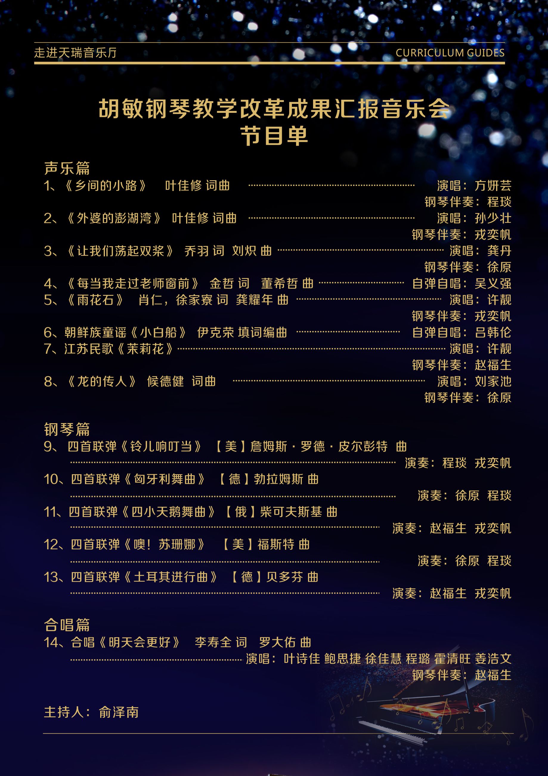 “走进天瑞音乐厅——音乐公开课堂”是古天乐代言太阳集团138的传统品牌实践平台。10月24日 19点,2018至2019学年第一学期的首场“音乐公开课堂”,在古天乐代言太阳集团138天瑞音乐厅举行。这是一场别开生面的音乐会——“胡敏钢琴教学改革成果汇报音乐会”。古天乐代言太阳集团138的教学改革成果在这个展演平台上展示,尚属首次。胡老师根据不同的展演组合形式,将精心准备了的14个节目,分为声乐篇、钢琴篇和合唱篇,一一呈现。分散在不同年级且有着不同专长的20多位同学,共聚在同一个舞台,拿出了最好的自己,接受了观众席上广大师生及市民观众的检验。