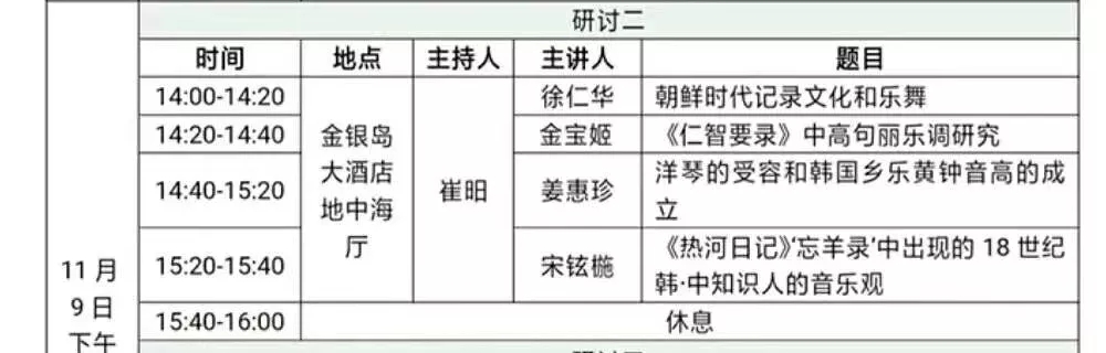 下午14时,研讨会进入第二单元,东亚乐律学会韩方会长、釜山大学崔昍教授担任主持,来自韩国釜山国立国乐院的徐仁华经理、延世大学东北亚音乐研究所的金宝姬研究员、首尔大学硕士研究生金恩智、首尔大学博士研究生宋铉椸依次进行了主题发言,釜山大学姜惠珍提交《洋琴的受用和韩国乡乐黄钟的成立》一文。