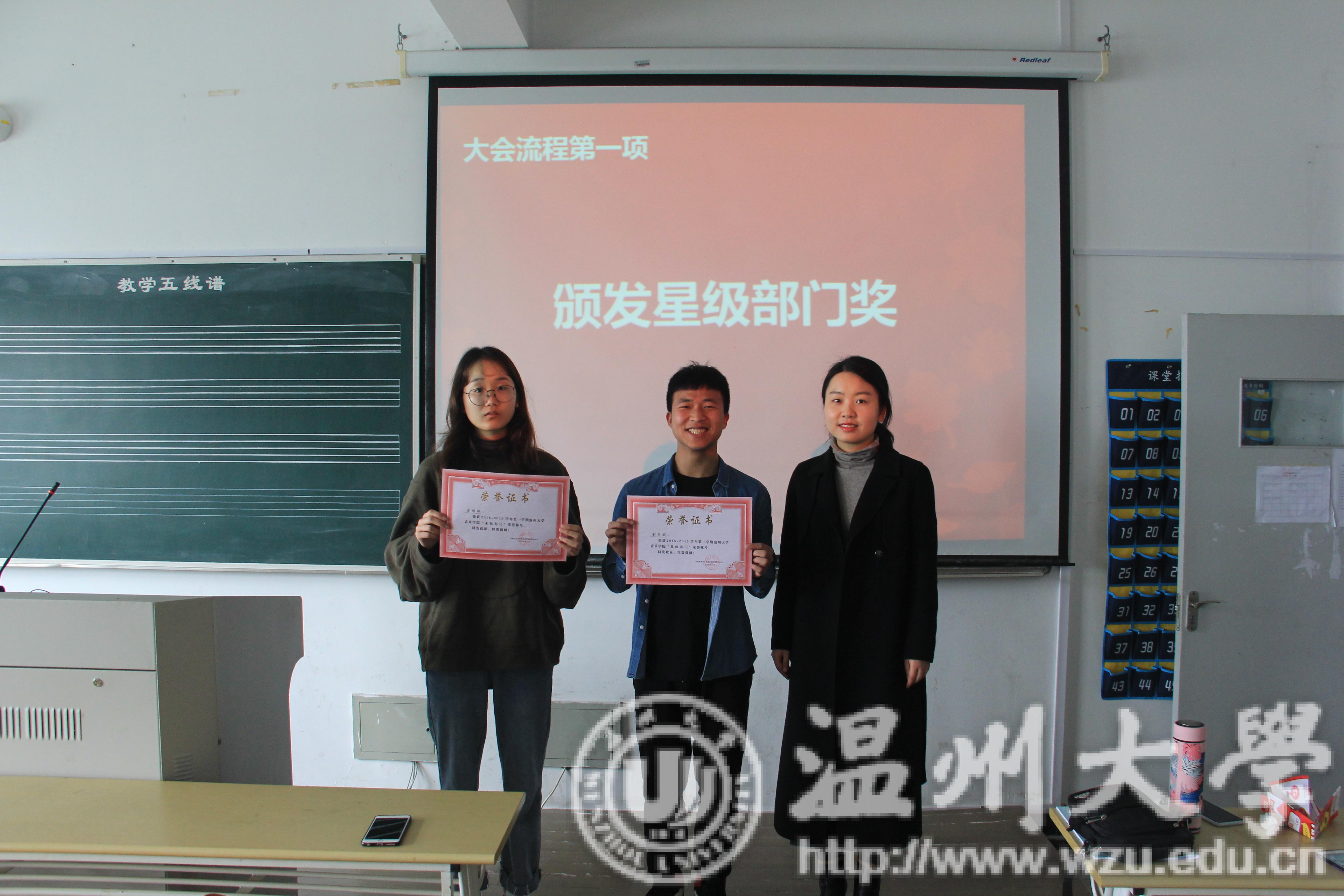 首先由何晨燕老师为大家颁发优秀干事奖,星级部门奖。接着是各部门部长对之前工作的简单小结,以及对自己部门接下来工作的补充与强调。最后周超主席提出了新的要求与期望,他强调了学习的重要性,员工会成员不仅需要学习成绩优异,而且要求工作突出,在工作中学习,以端正的工作态度对待每一项任务;指出员工会是一个团结的大家庭,要将员工会打造成团结一心、和谐进步的学习型团队。周超主席并希望大家在接下来的工作中能够共同努力,把本次大会作为一个新的起点,将古天乐代言太阳集团138员工会最好的精神风貌展现给全校员工。