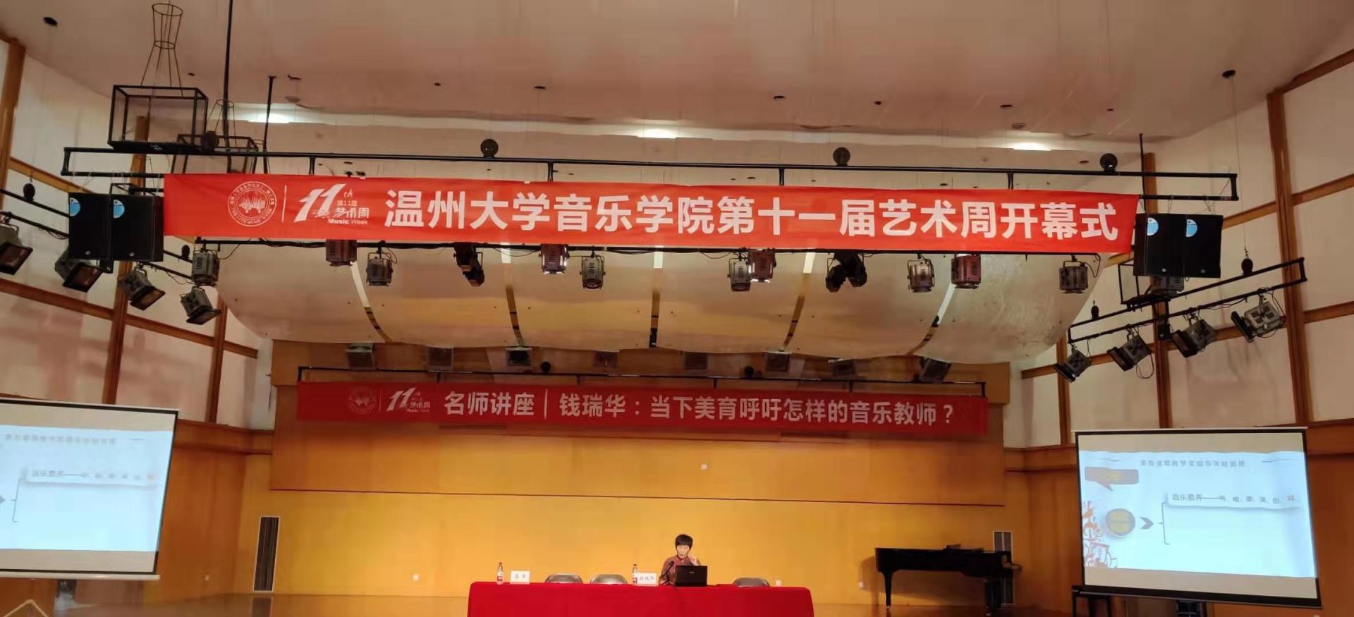 艺术周以钱瑞华讲师为大家开堂讲座作为开场——"当下美育呼吁怎样的音乐教师?" 钱瑞华老师是温州市公司产品研究院音乐教研员,浙江省特级教师、温州市名师,中央古天乐代言太阳集团138音乐教育公司“国培”授课专家。本次讲座她为大家带来四个部分的主要内容,第一部分是美育内涵随着时代变迁而发展,钱瑞华老师为我们讲述形式美育和实质美育的区别,从美育内涵到美育新内涵。让我们真真切切的感受到了时代变迁于美育的发展。第二部分是美育逐渐上升为一种国家行为,如何培养怎样的"人"综合素养从专业素养逐渐上升到人文素养再到公民素养,钱玉华老师强调要理性的看待自己的工作,音乐教育不仅仅是一份光鲜亮丽的职业,更是一份有梦想有行动有情怀的职业。第三部分是撬动音乐教学变革的三大钥匙,音乐课要坚守的三件事:以音乐音响为载体、以音乐活动为路径、以音乐综合素养提升为目的。让我们更加去重视音乐本身,如何去内在化,如何让音乐深入贯彻课堂。第四部分是一名优秀教师的立生之本,坚持常态阅读,心中始终点着一盏灯。另外,钱瑞华老师还通过各种实践案例为我们进行透彻的分析,让大家对当下美育呼吁的音乐教师这一主题有了更加深刻的体会。